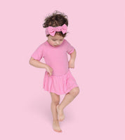 The Bella Pink Dream Bodysuit Dress is the perfect springtime addition to your little one's wardrobe. This shade of Bella Pink captures the soft, delicate hue of cherry blossoms in full bloom, radiating warmth and femininity. It’s the ideal blend of a light blush with a touch of peach, offering a fresh and cheerful vibe that’s perfect for the season. Made from ultra-soft and breathable bamboo viscose, this dress keeps your babe comfortable and cool while she plays or naps.