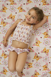 Say hello to sunshine and fun with the Blossom Butterfly Dream Smocked Tankini Two-Piece Swimsuit! This sweet and cheerful swim set is perfect for little beach lovers who want to flutter into fun with colorful butterflies, cheerful flowers, and twinkling stars. The pastel pink, lavender, and yellow hues, along with the charming daisy-like flowers, create an enchanting vibe, while soft peachy-pink tones add a warm, inviting touch.