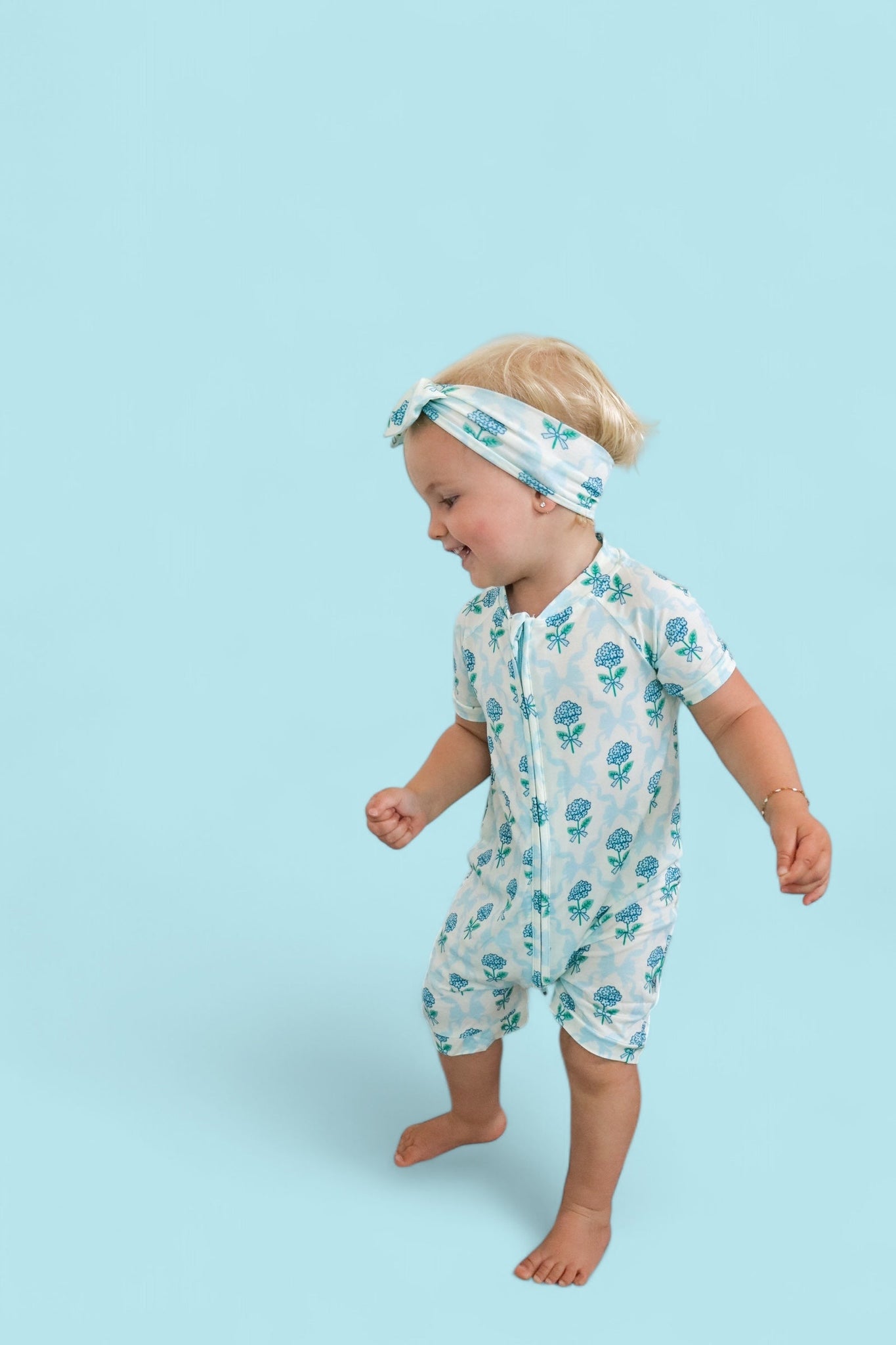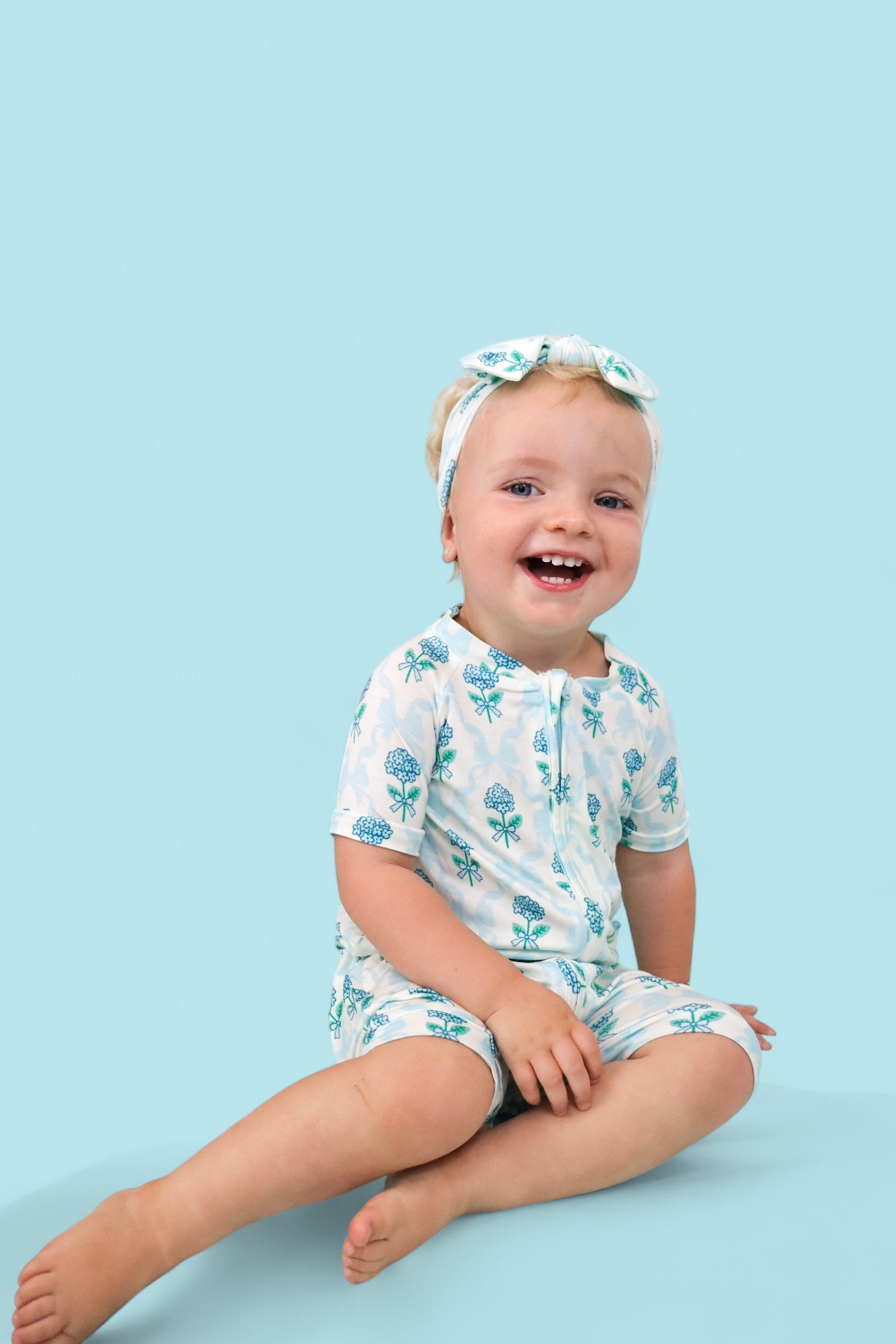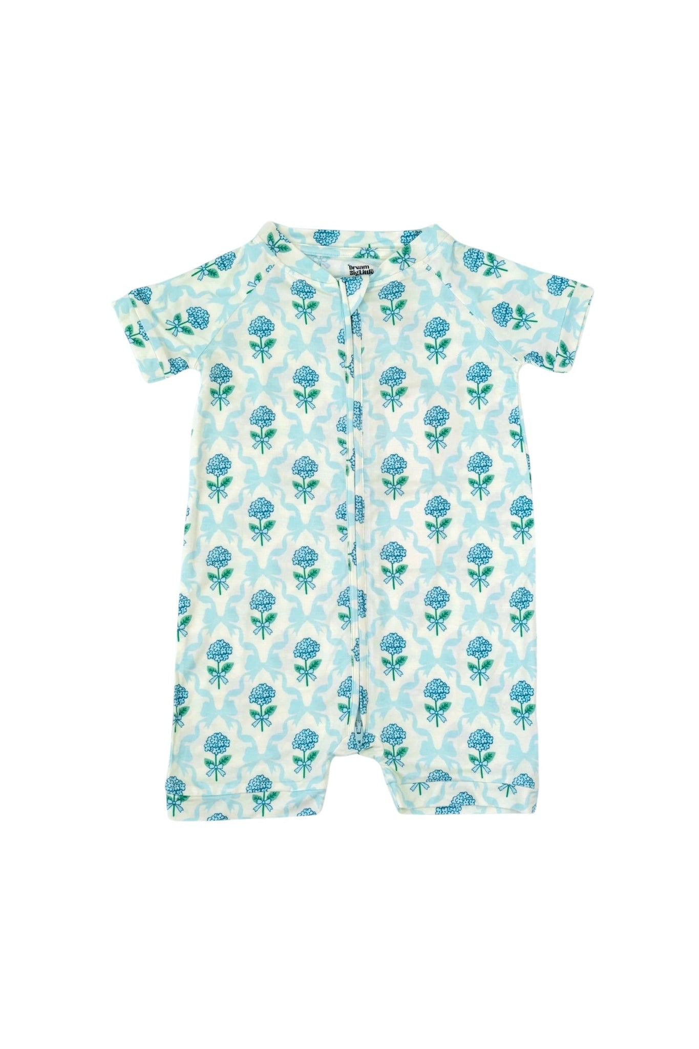 Our Blue Ribbon Blooms Dream Shortie brings timeless elegance to warm-weather days with its dainty clusters of blue florals, delicate bows, and soft green leaves—all beautifully arranged on a creamy background. Subtle blue ribbon silhouettes in the background add a touch of whimsy, giving this piece a polished and heirloom-inspired feel.