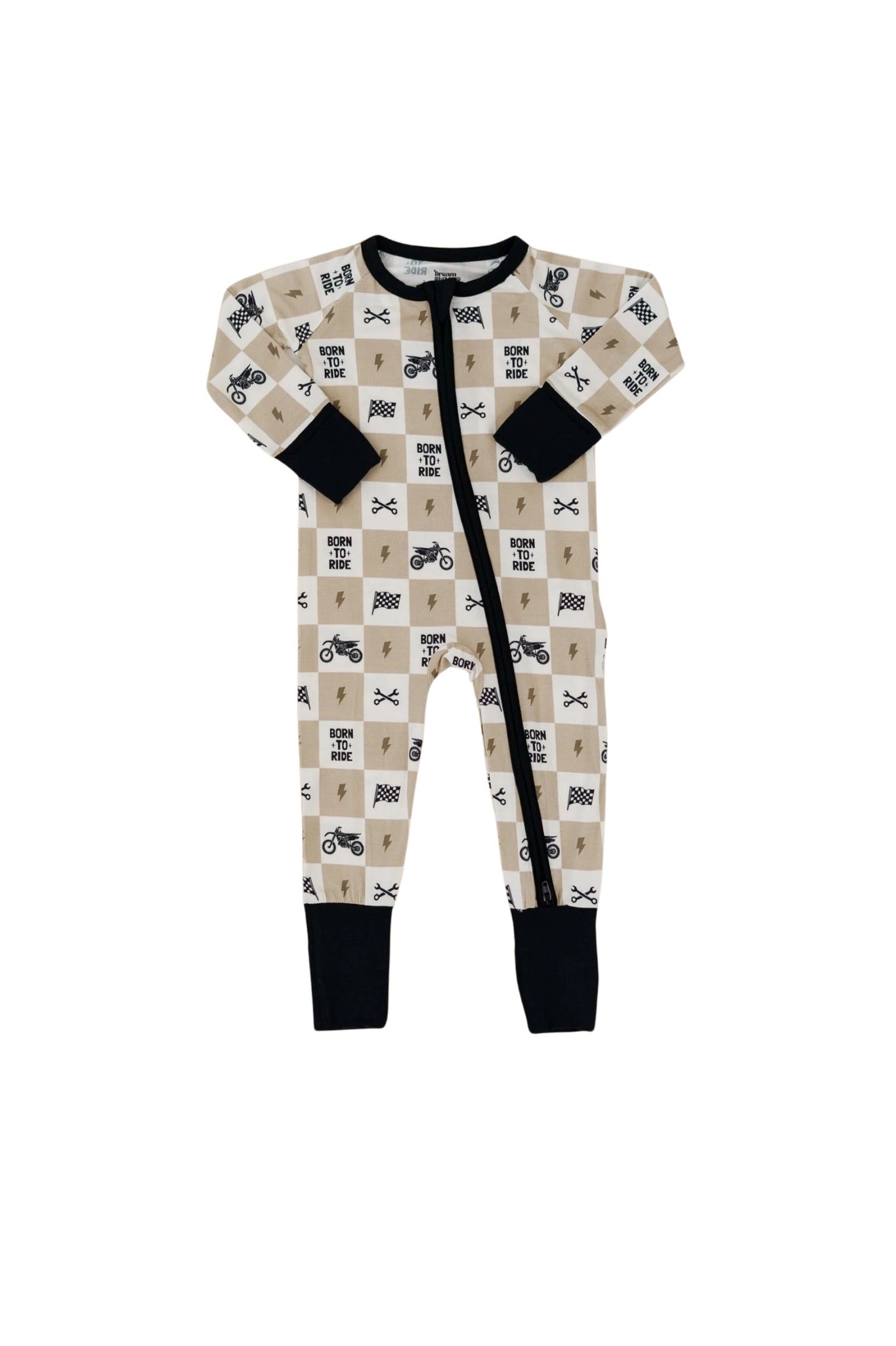 Rev up the style with our Born to Ride Dream Romper! Featuring a bold beige-and-white checkerboard pattern adorned with motorcycles, “Born to Ride” text, wrenches, racing flags, and lightning bolts, this romper is a nod to the spirit of adventure. Whether your little one is dreaming of open roads or simply enjoying some cozy downtime, this vintage biker-inspired design makes every moment feel daringly fun.