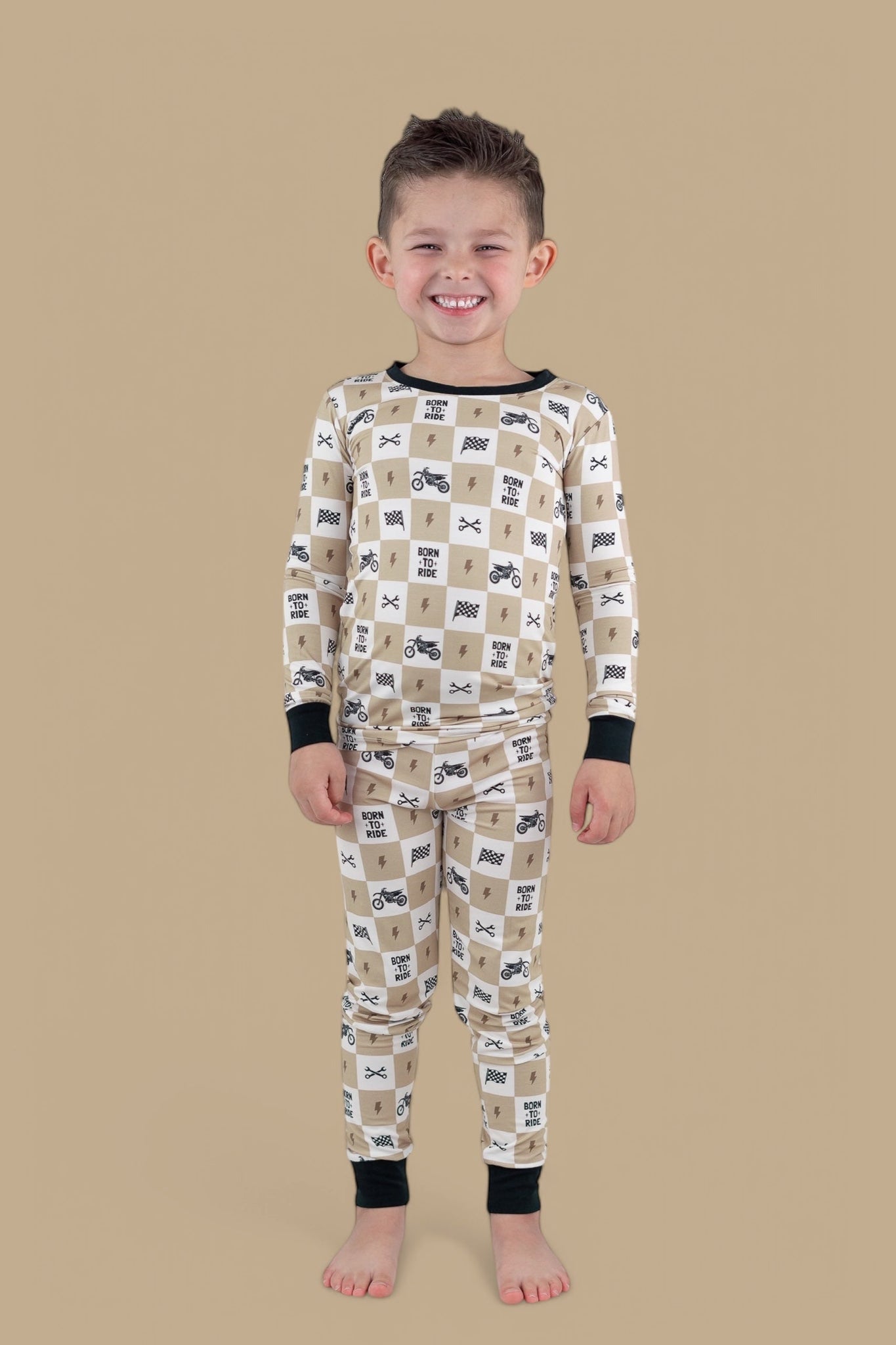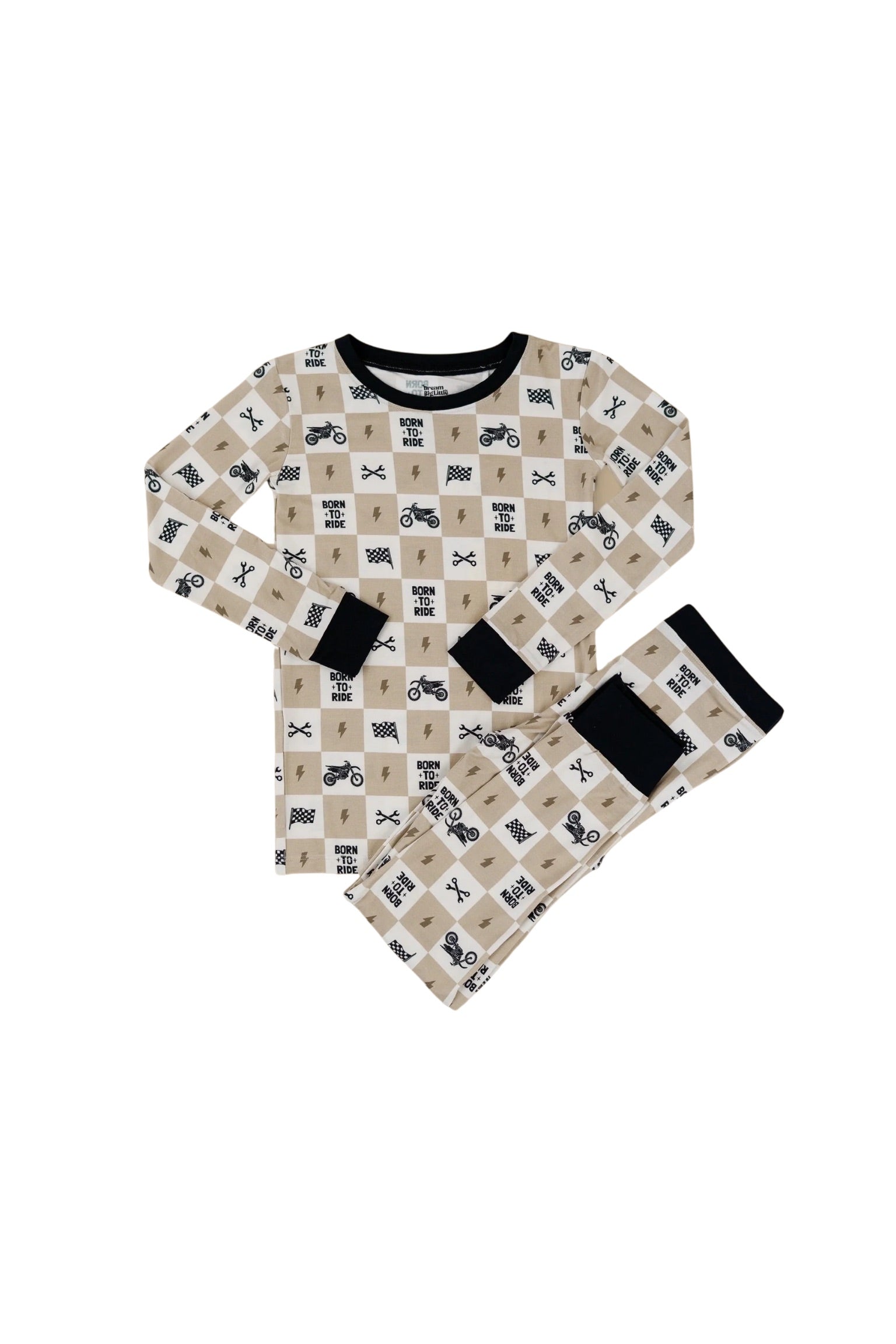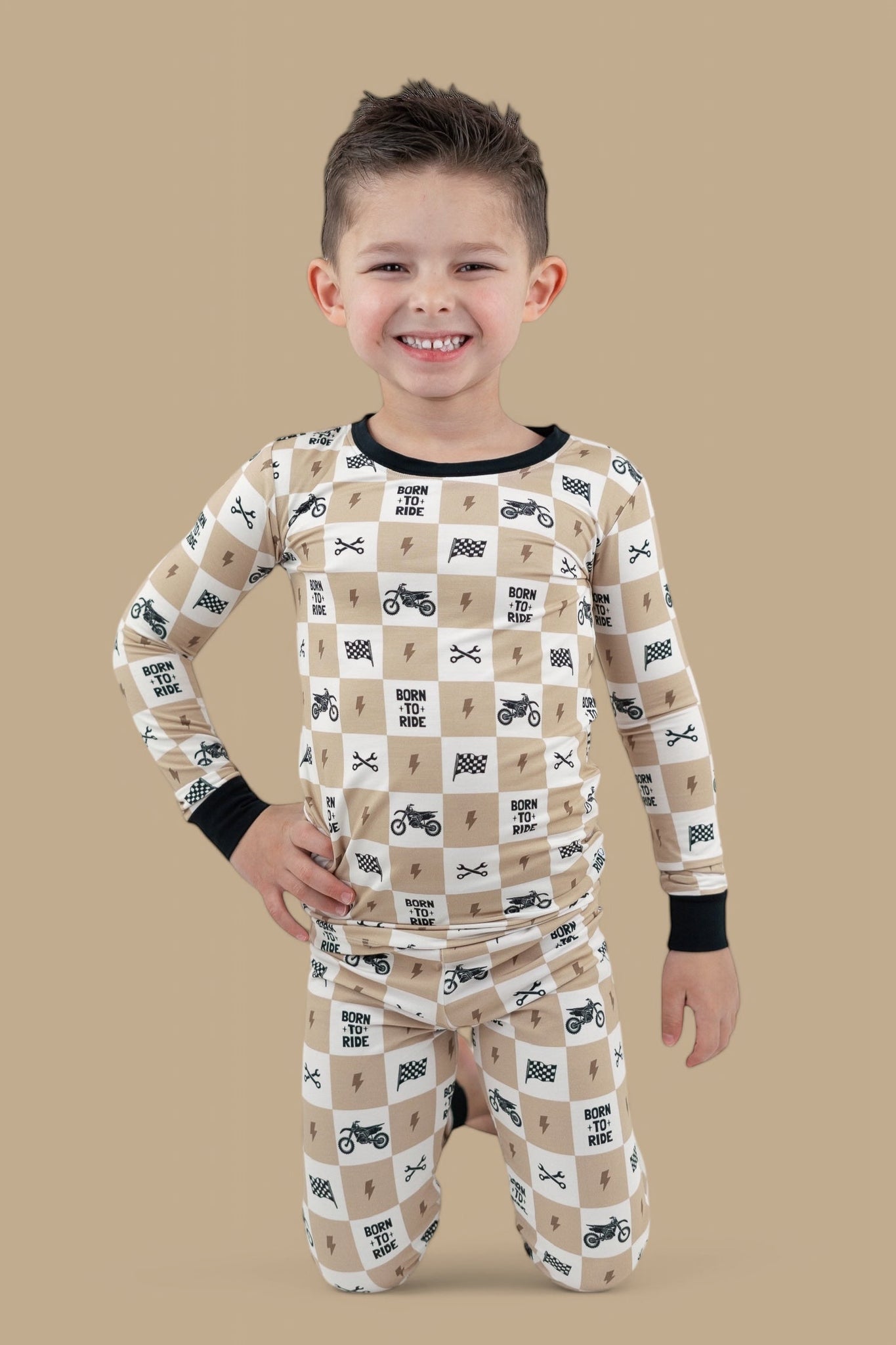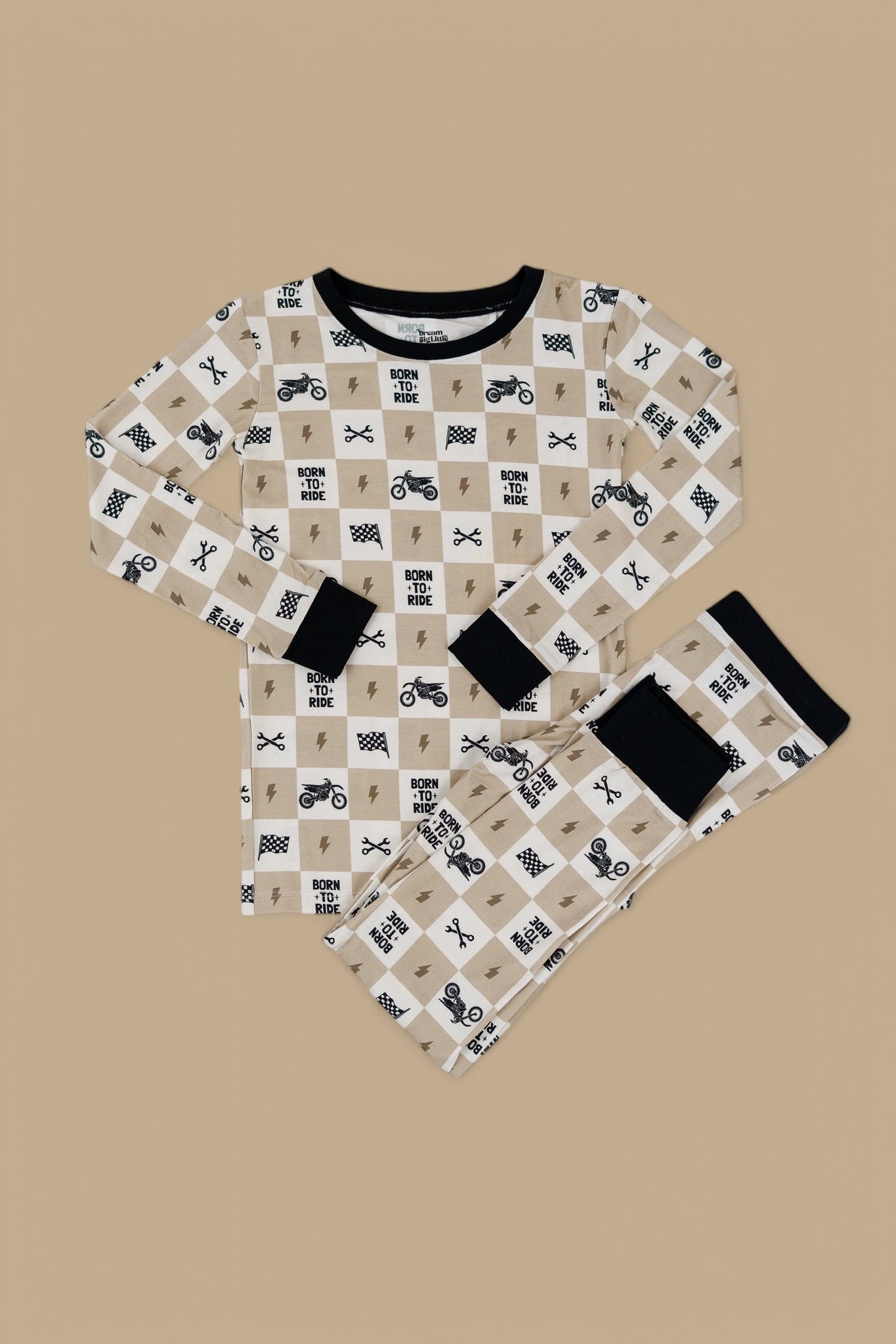 Ignite your little one’s adventurous spirit with the Born to Ride Dream Set! Designed for comfort and style, this seasonal bamboo viscose pajama set boasts a checkerboard pattern of alternating beige and white squares. Each square is adorned with exciting motorcycle-themed elements: bold "Born to Ride" text, classic motorcycle illustrations, black-and-white racing flags, wrenches, and lightning bolt icons, bringing an energetic and edgy vibe to your child’s wardrobe.