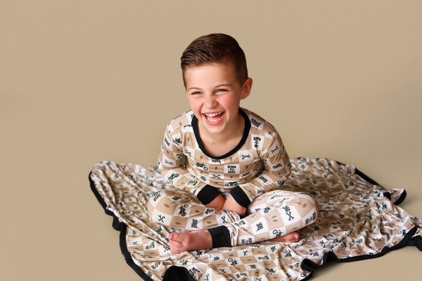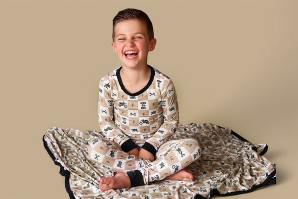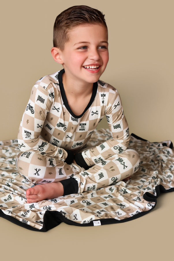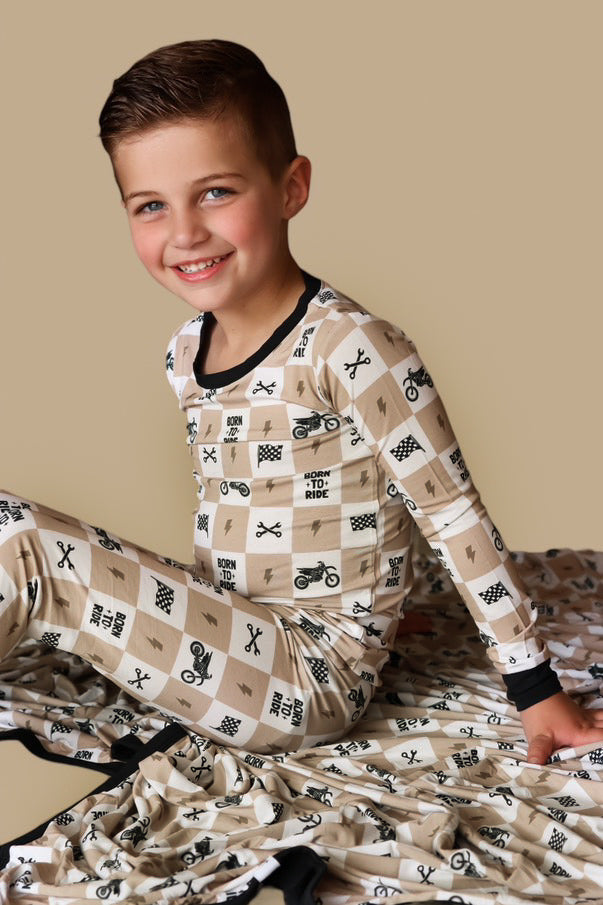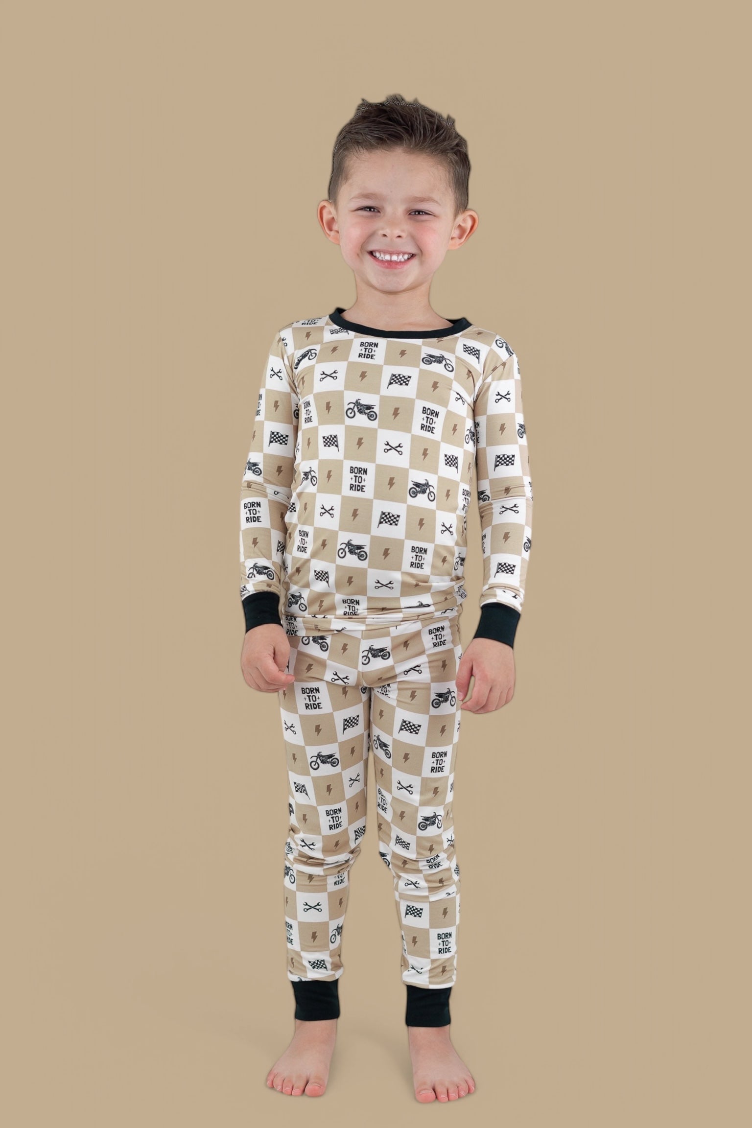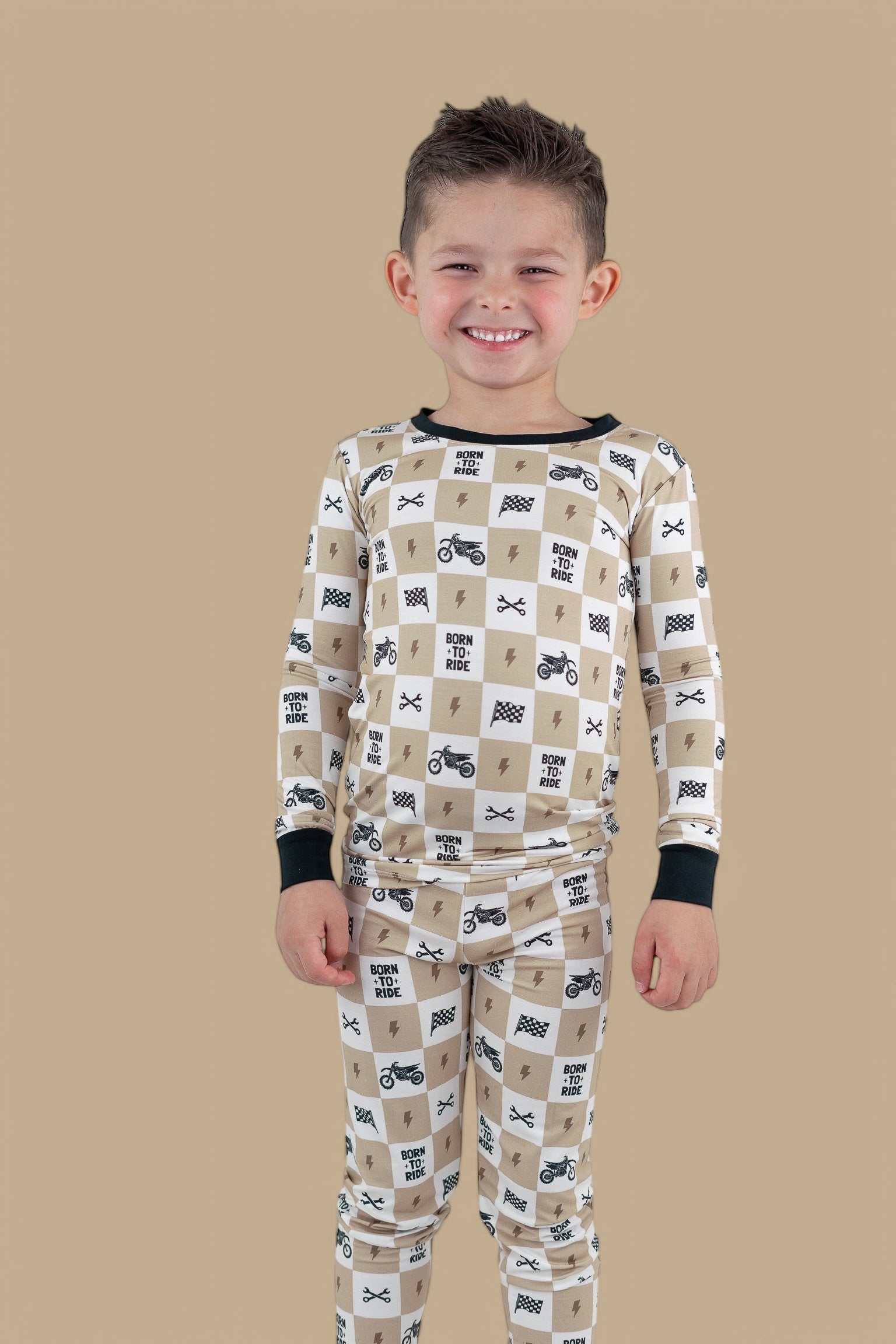Ignite your little one’s adventurous spirit with the Born to Ride Dream Set! Designed for comfort and style, this seasonal bamboo viscose pajama set boasts a checkerboard pattern of alternating beige and white squares. Each square is adorned with exciting motorcycle-themed elements: bold "Born to Ride" text, classic motorcycle illustrations, black-and-white racing flags, wrenches, and lightning bolt icons, bringing an energetic and edgy vibe to your child’s wardrobe.