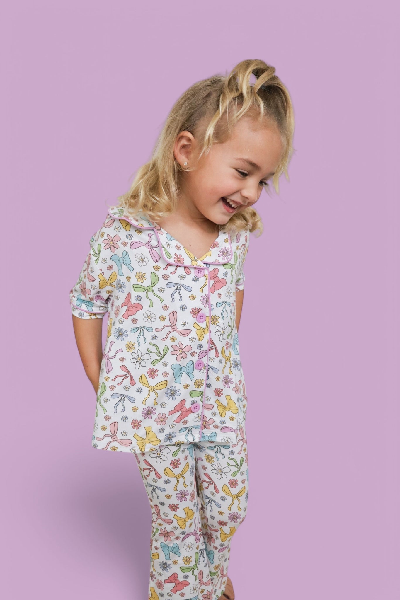 Spring into style with our Bow Garden Dream Girl's Flare Set, a delightful ensemble perfect for your little trendsetter! Featuring a whimsical bow garden print in soft, pastel hues, this set captures the beauty of blooming flowers and sunshine-filled days. The short-sleeve top pairs effortlessly with flared bottoms, creating a playful yet elegant look your little one will adore.