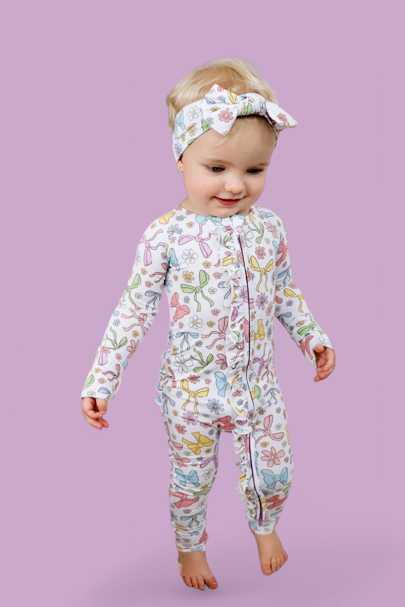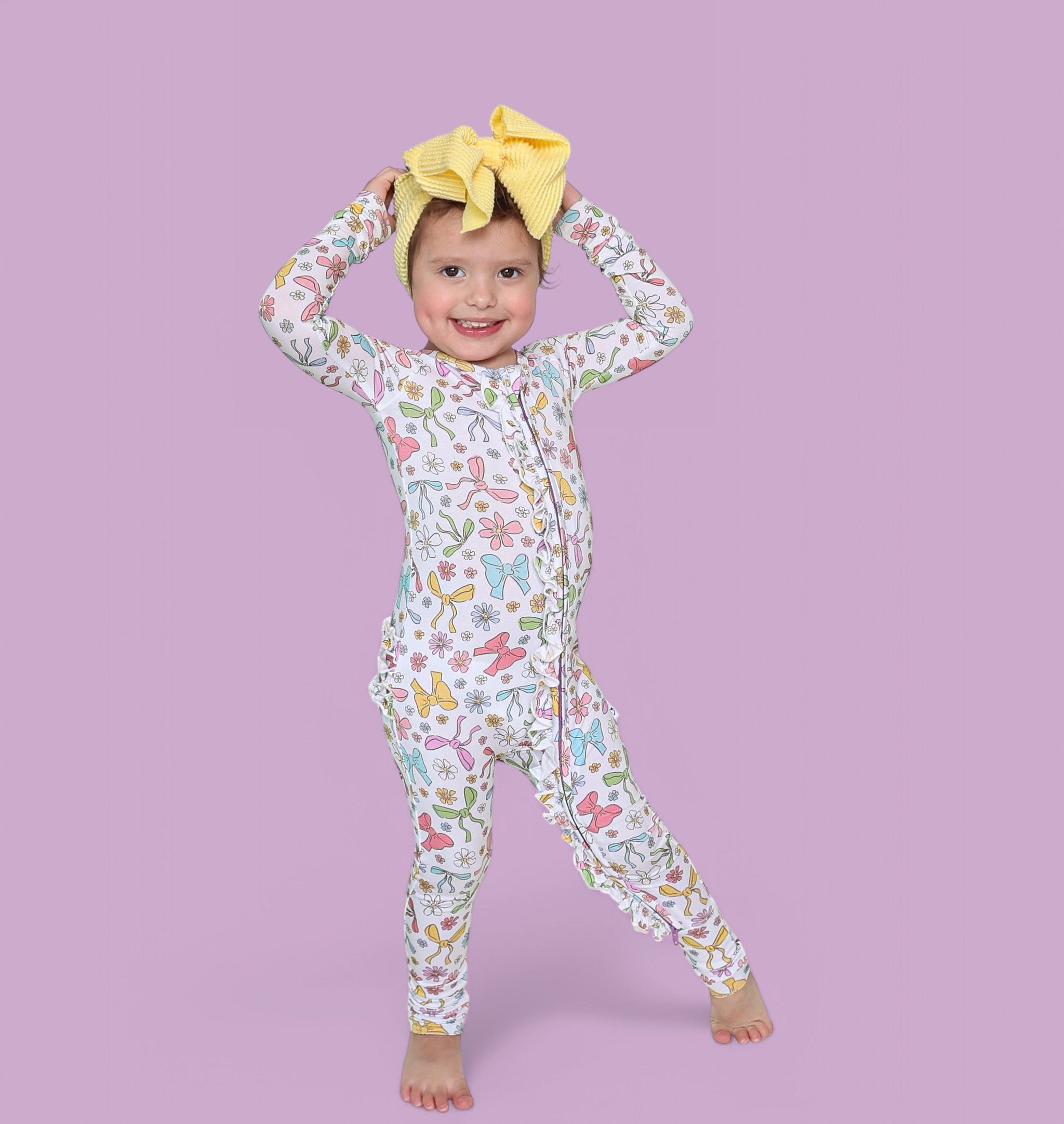 Celebrate the charm of spring with our Bow Garden Dream Ruffle Romper! Featuring a delightful garden-inspired print of blooming bows in soft, cheerful hues, this romper is perfect for your little one’s playful days and cozy nights.