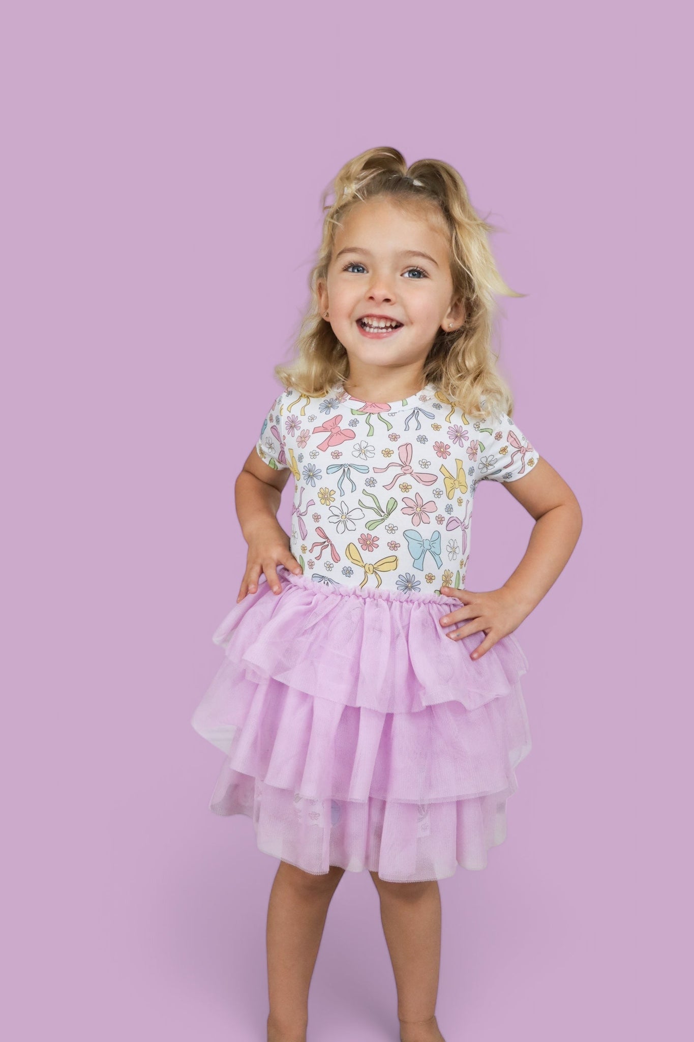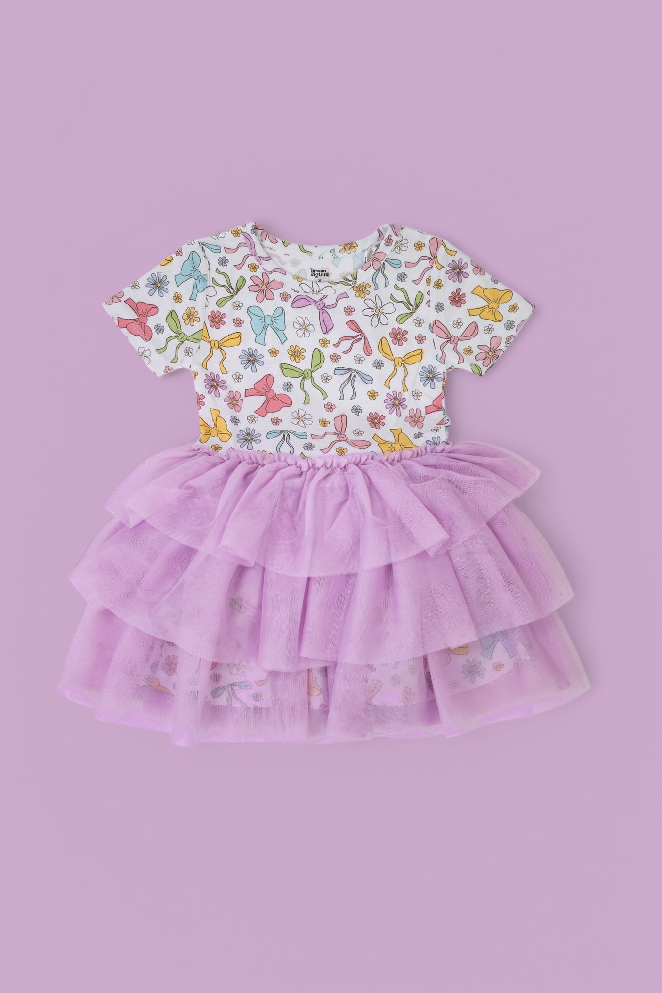 Step into spring with the Bow Garden Dream Tutu Dress, a whimsical delight for your little one’s wardrobe. This enchanting dress features a soft, short-sleeve top adorned with a charming print of colorful bows, blooming flowers, and delicate ribbons in cheerful pastel hues—perfectly capturing the magic of a blossoming garden.