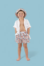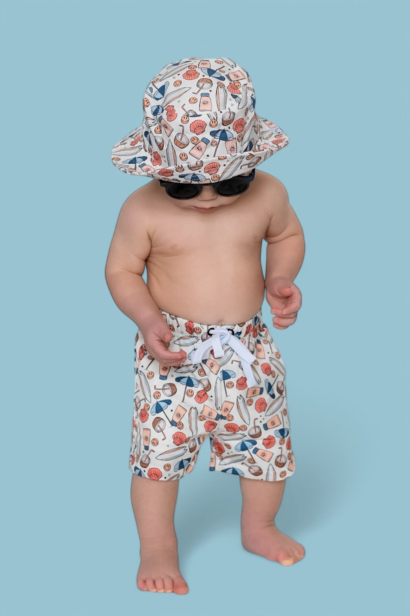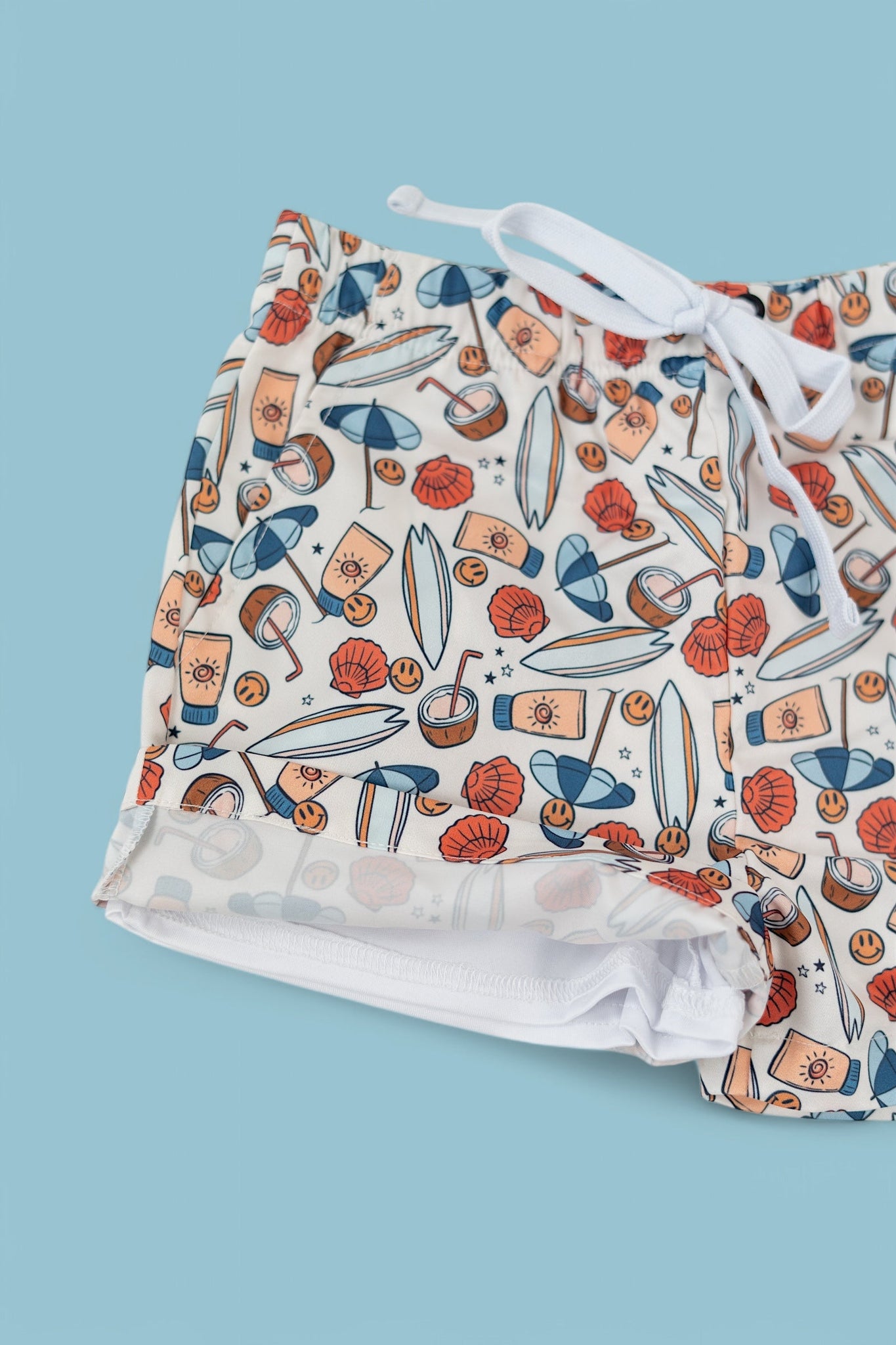 Our Chase the Sun Boy’s Dream Swim Trunks are a must-have for every little beach lover. Bursting with playful energy, this cheerful print features hand-drawn surfboards, coconuts, smiley faces, seashells, parasols, and more—capturing the carefree joy of summer days. With a retro-inspired color palette of peachy tones, ocean blues, and sandy neutrals, these trunks bring sunshine wherever your kiddo goes.