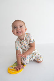 Bring the magic of JJ and his musical adventures to your little one's wardrobe with our CoComelon x Dream Big Little Co JJ Musical Melon Dream Shortie! Designed with playful musical notes, twinkling stars, and, of course, JJ, this cream-colored short romper is sure to brighten up any day. Whether it's a fun playdate or a cozy nap, this adorable shortie will keep your child comfy and stylish all day long.