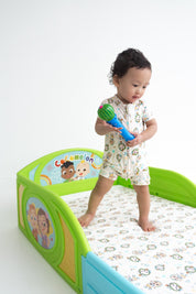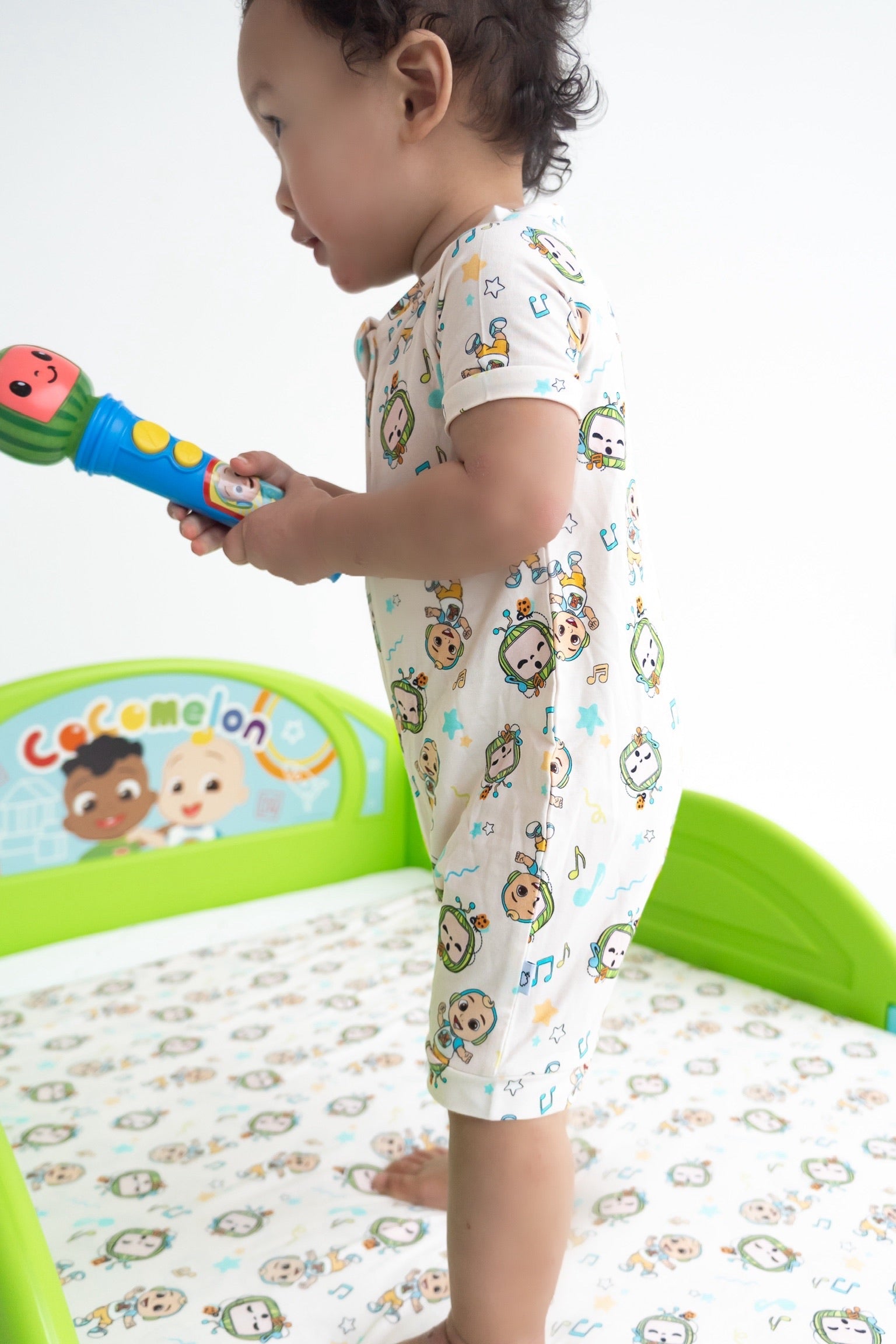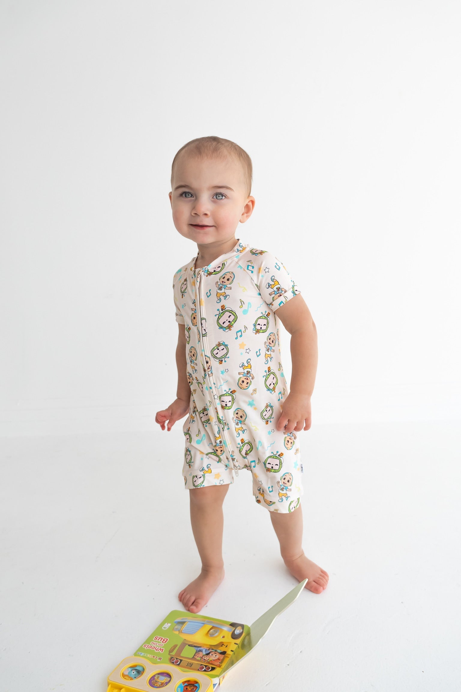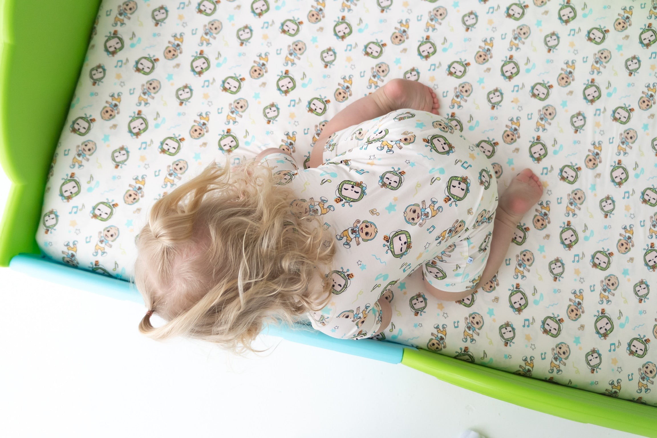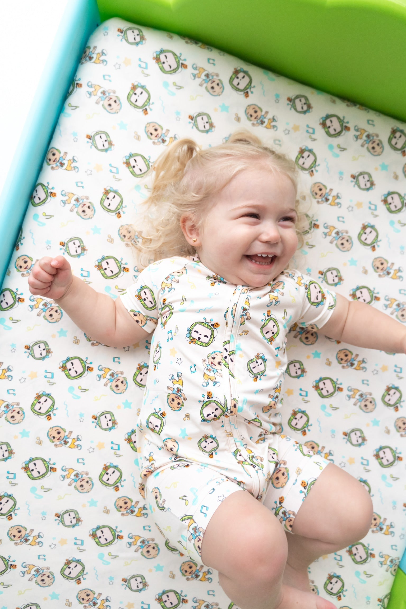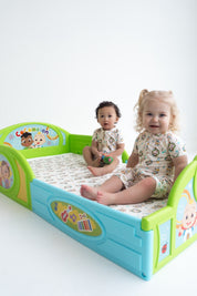 - Adorable CoComelon print with musical notes, stars, and JJ