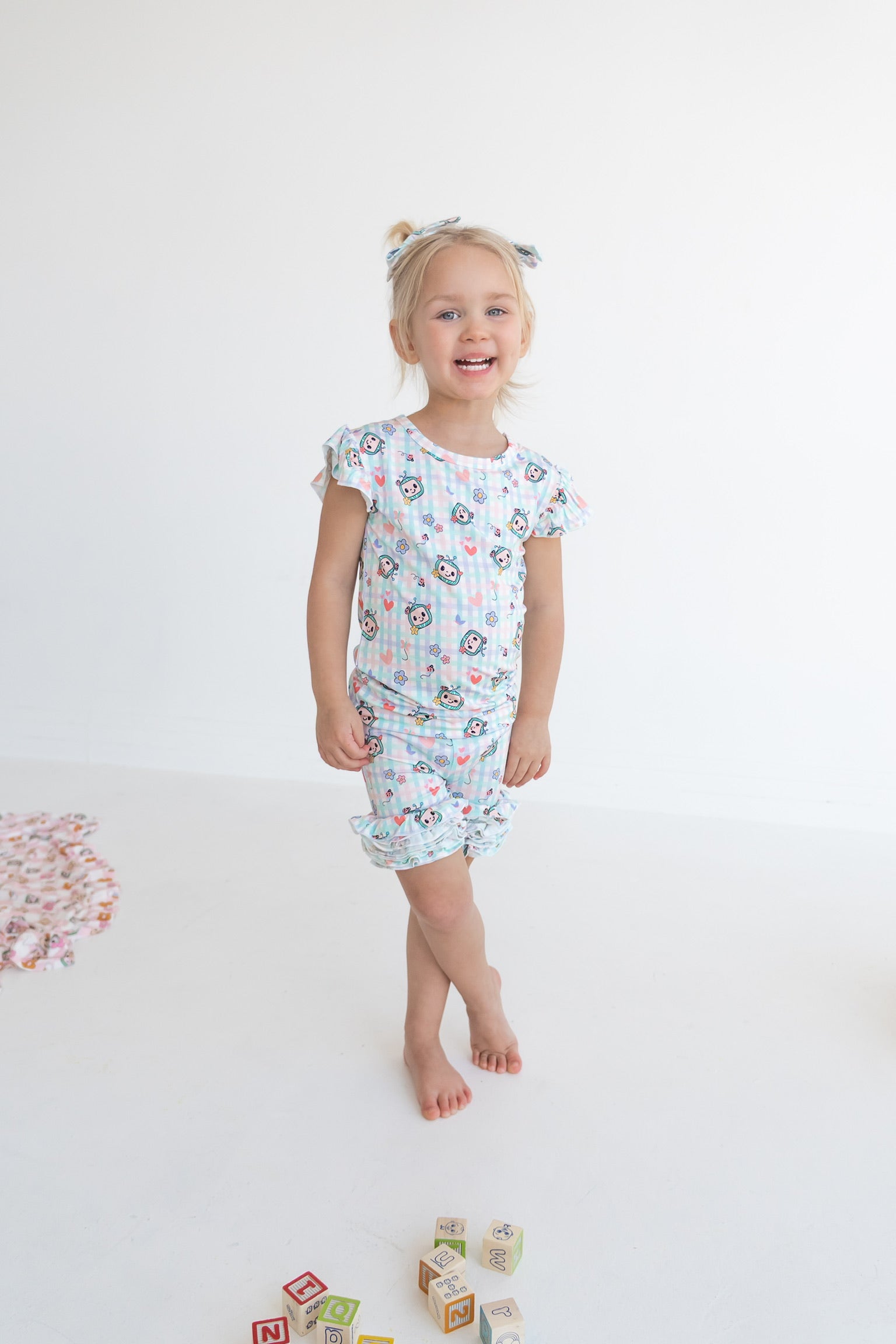 Get ready for fun in the sun with the CoComelon x Dream Big Little Co Springtime Melon Dream Ruffle Shorts! Perfect for your little one’s spring wardrobe, these adorable shorts feature a light pink and blue gingham print with hearts and flowers, bringing a burst of color and joy. The playful design is completed with a favorite CoComelon character, adding a touch of whimsy to every adventure.