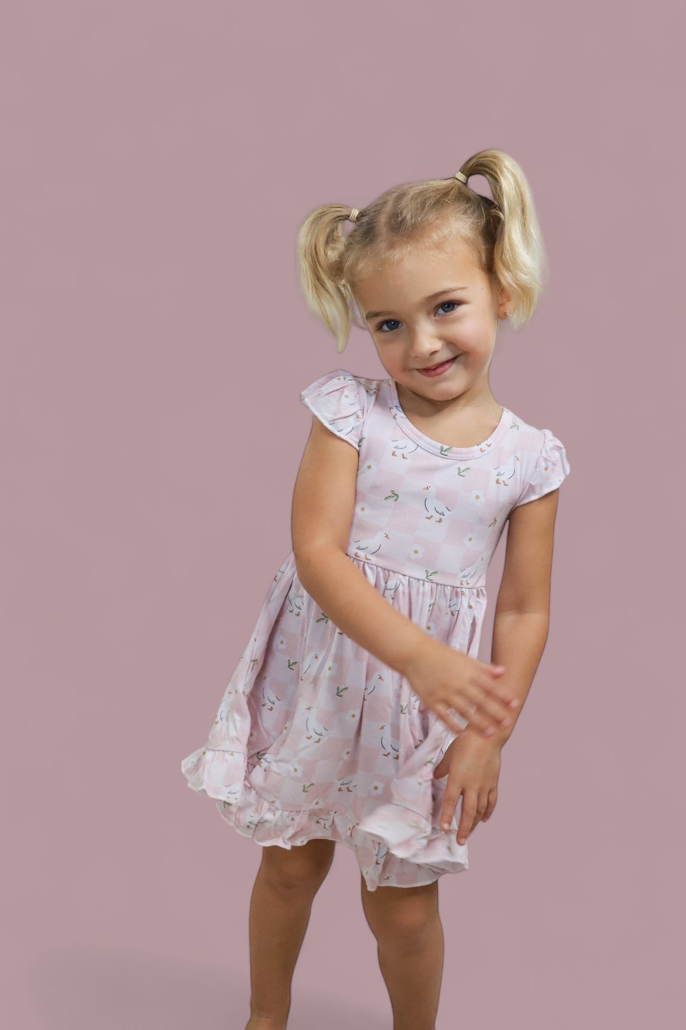 EXCLUSIVE DUCKS AND DAISIES DREAM CAP SLEEVE RUFFLE DRESS
