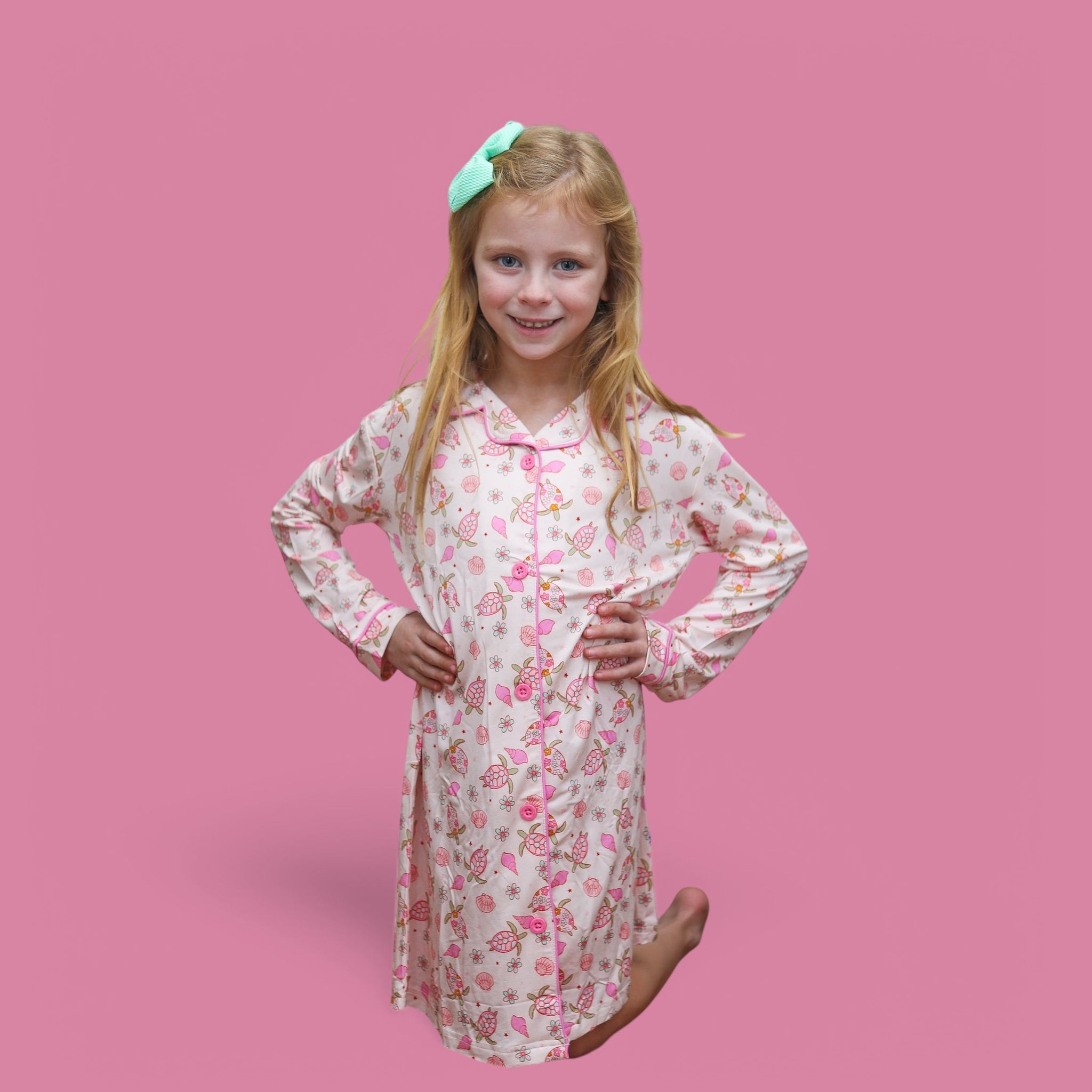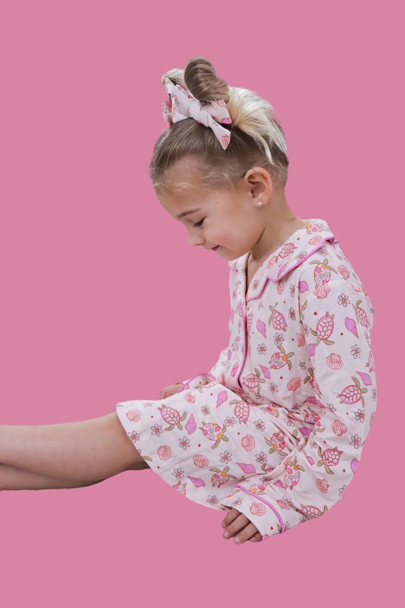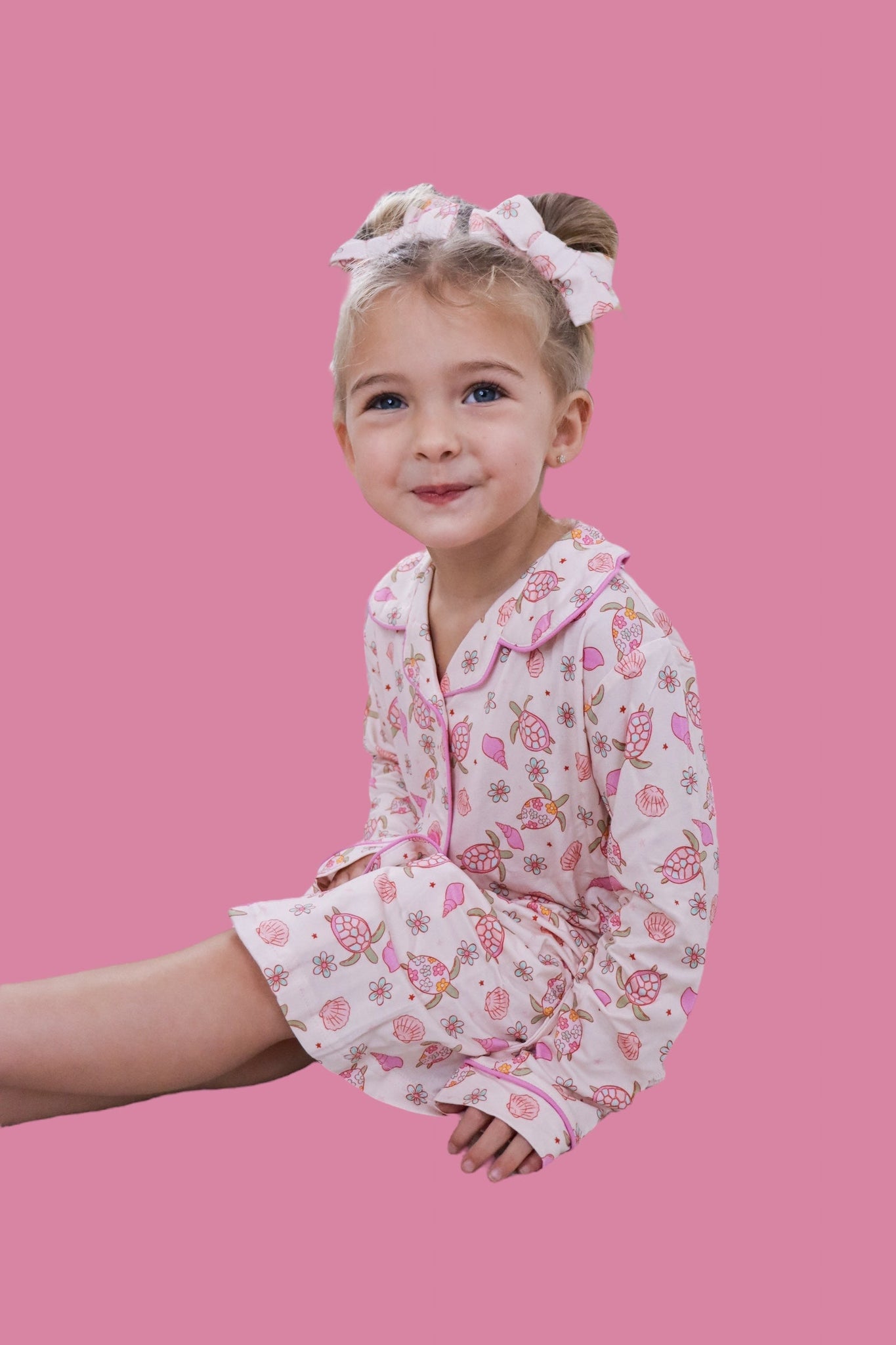 Dive into dreamland in style with our Exclusive Love Your Shell Girl's Dream Gown. Perfect for fashionistas, this gown combines whimsy and comfort for a night of sleep and play. Featuring adorable sea turtles in pink, orange, and green patterns, your little one will be enchanted by these colorful creatures as they drift off to sleep. Scattered across the soft pink background are seashells, flowers, and leaves in gentle pastel hues, creating an ocean-inspired dreamscape. Tiny brown stars add a touch of sparkle, making this gown truly magical.