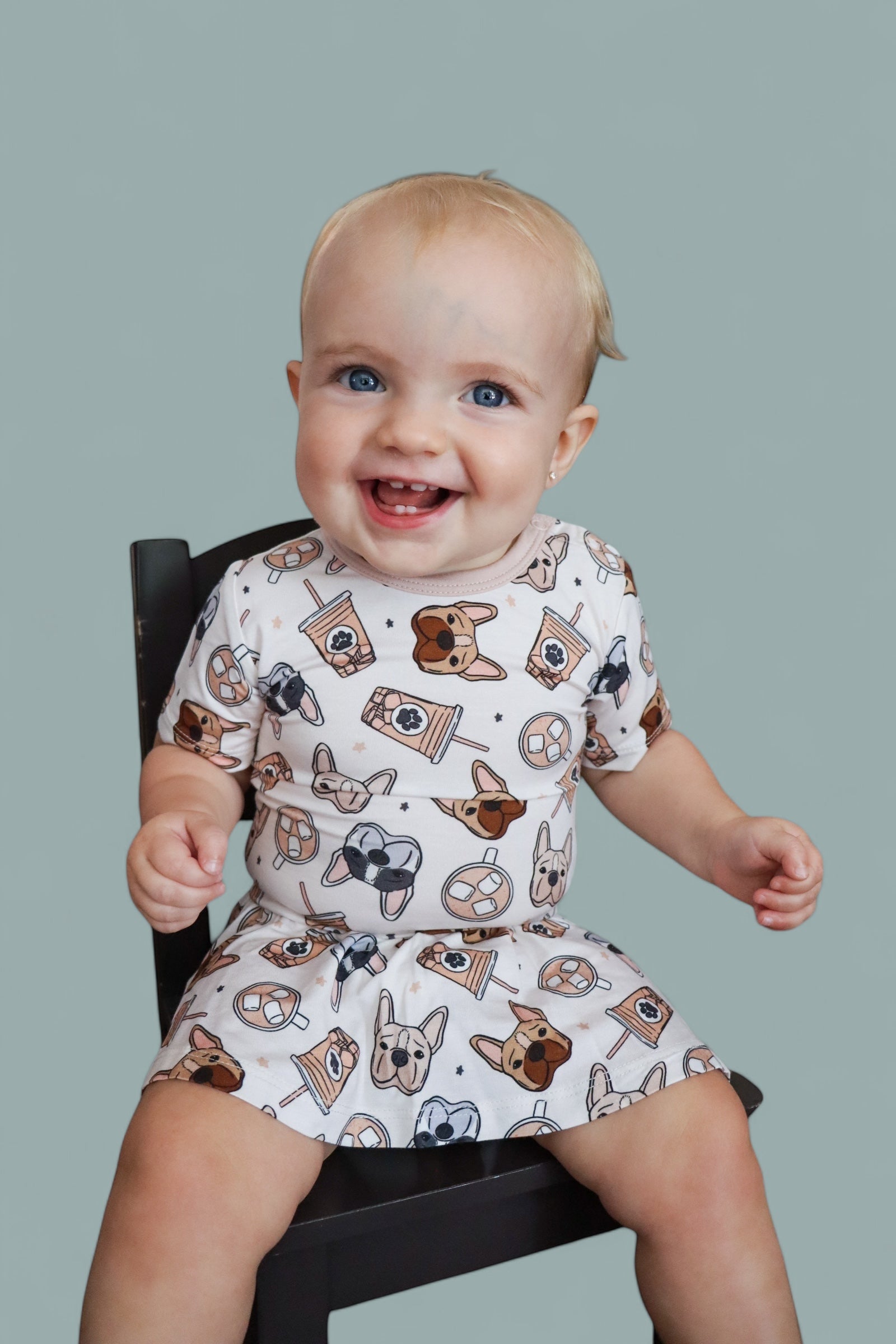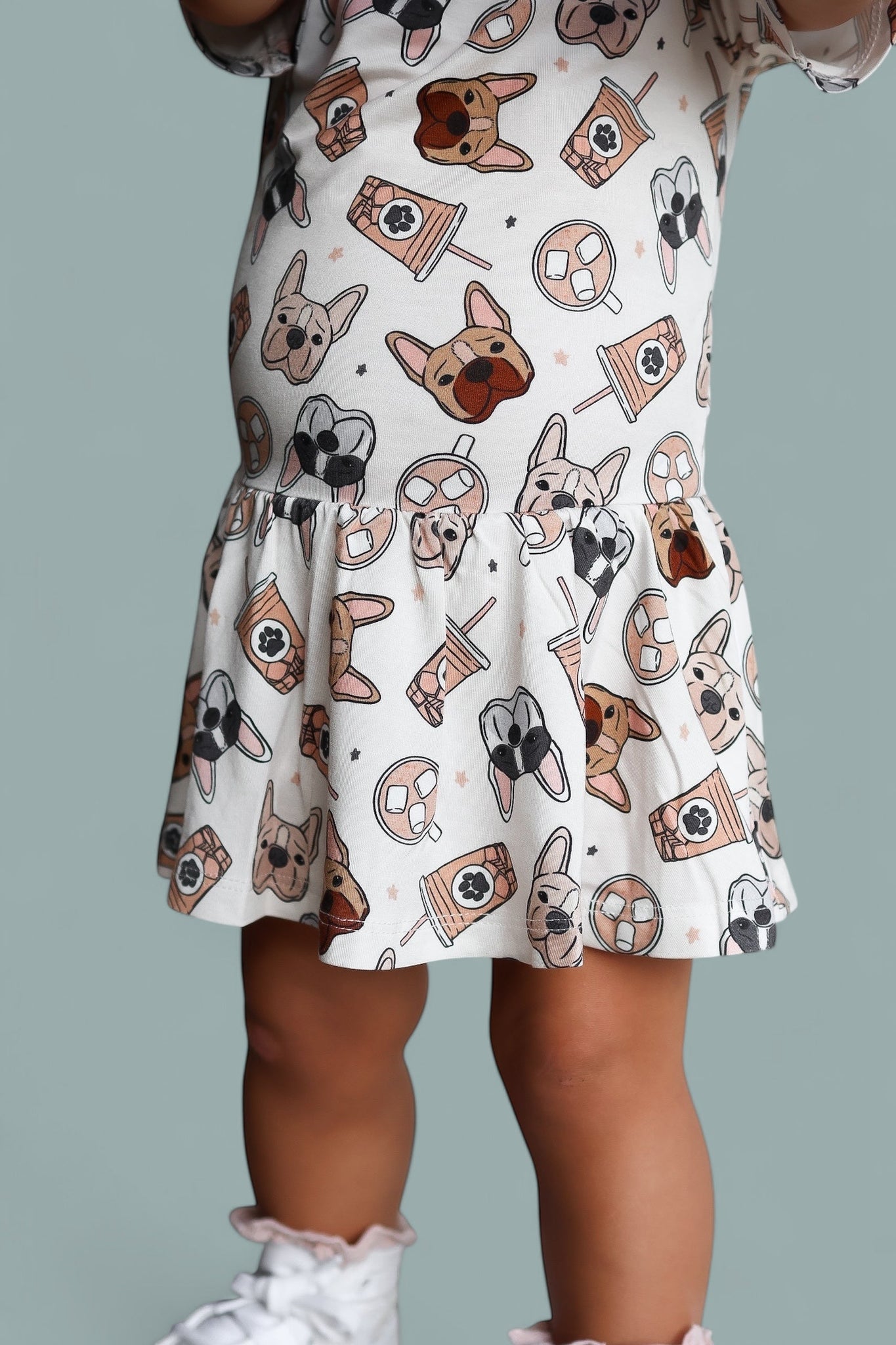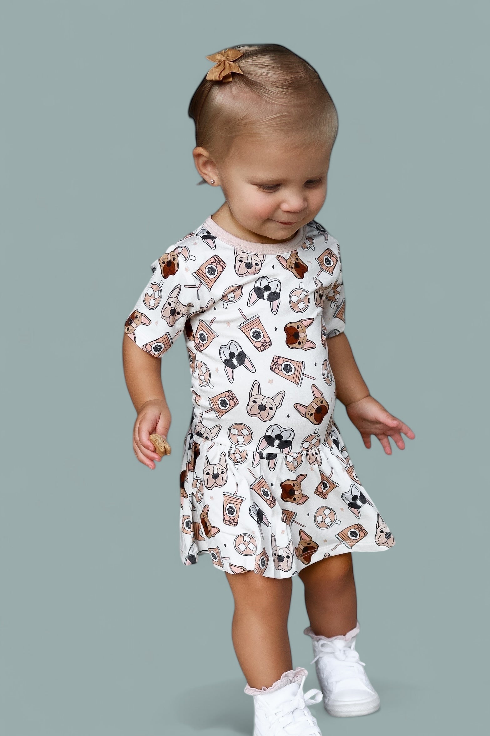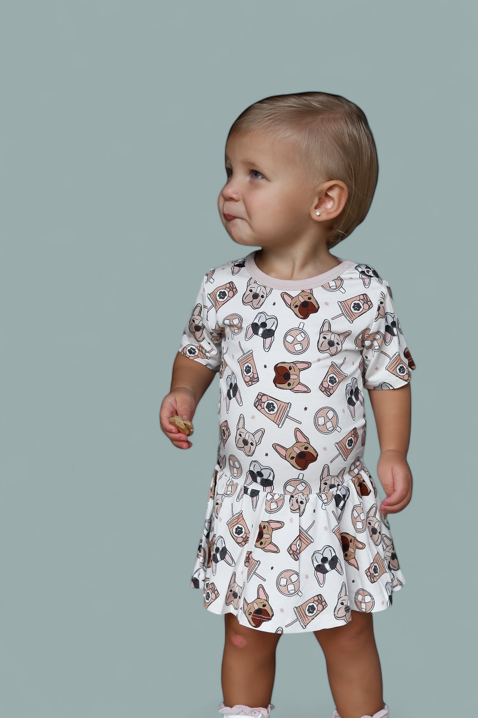 This adorable Dream Bodysuit Dress is a must-have for your little girl! With its cute design featuring favorite drinks and adorable Frenchies, it'll be an instant hit. Don't miss out on this cuteness overload!