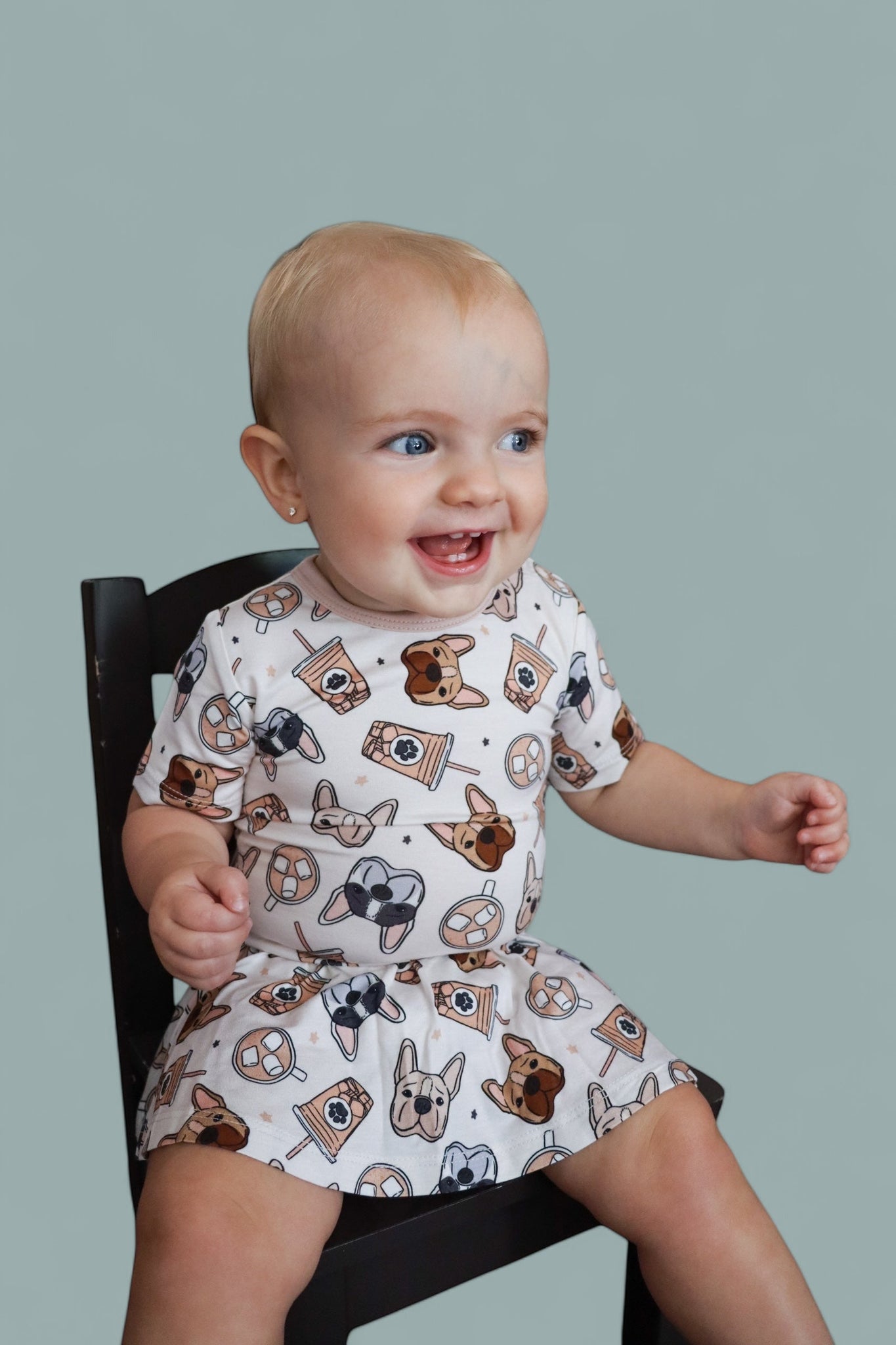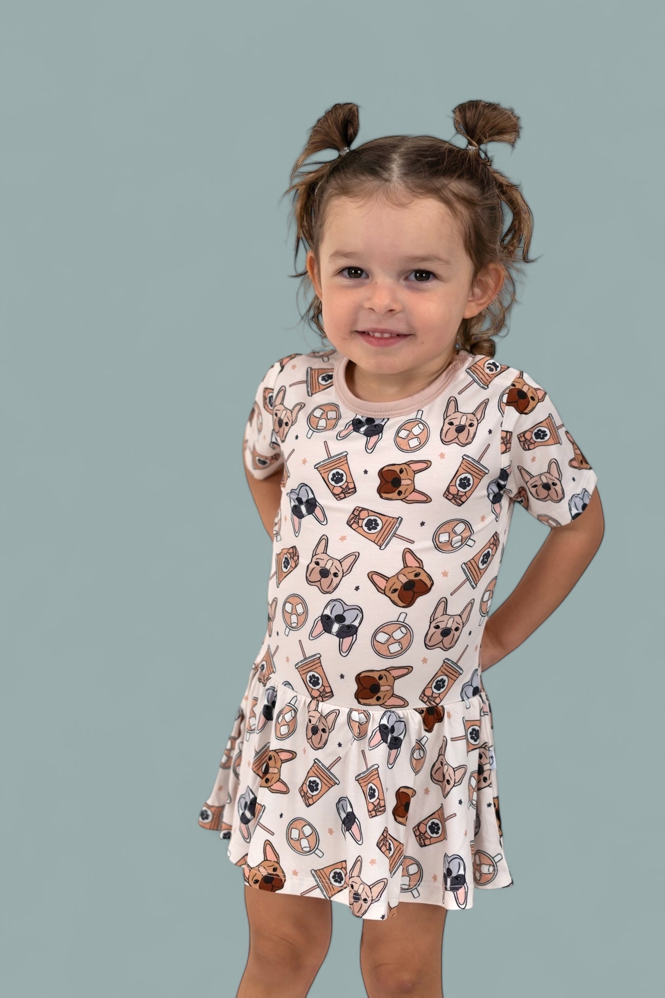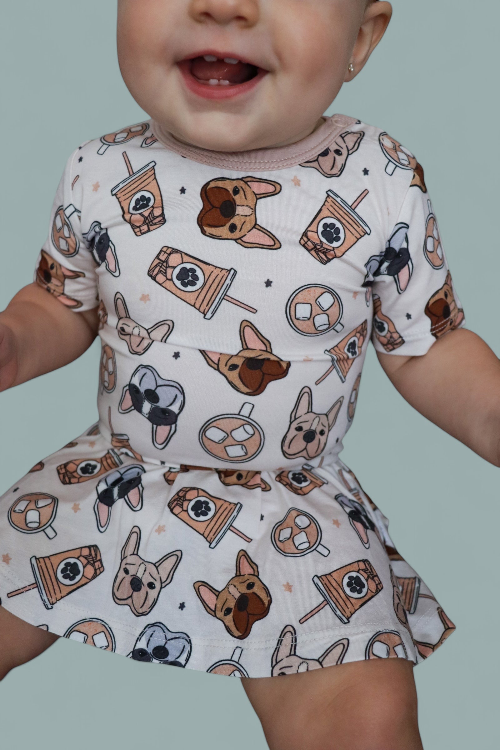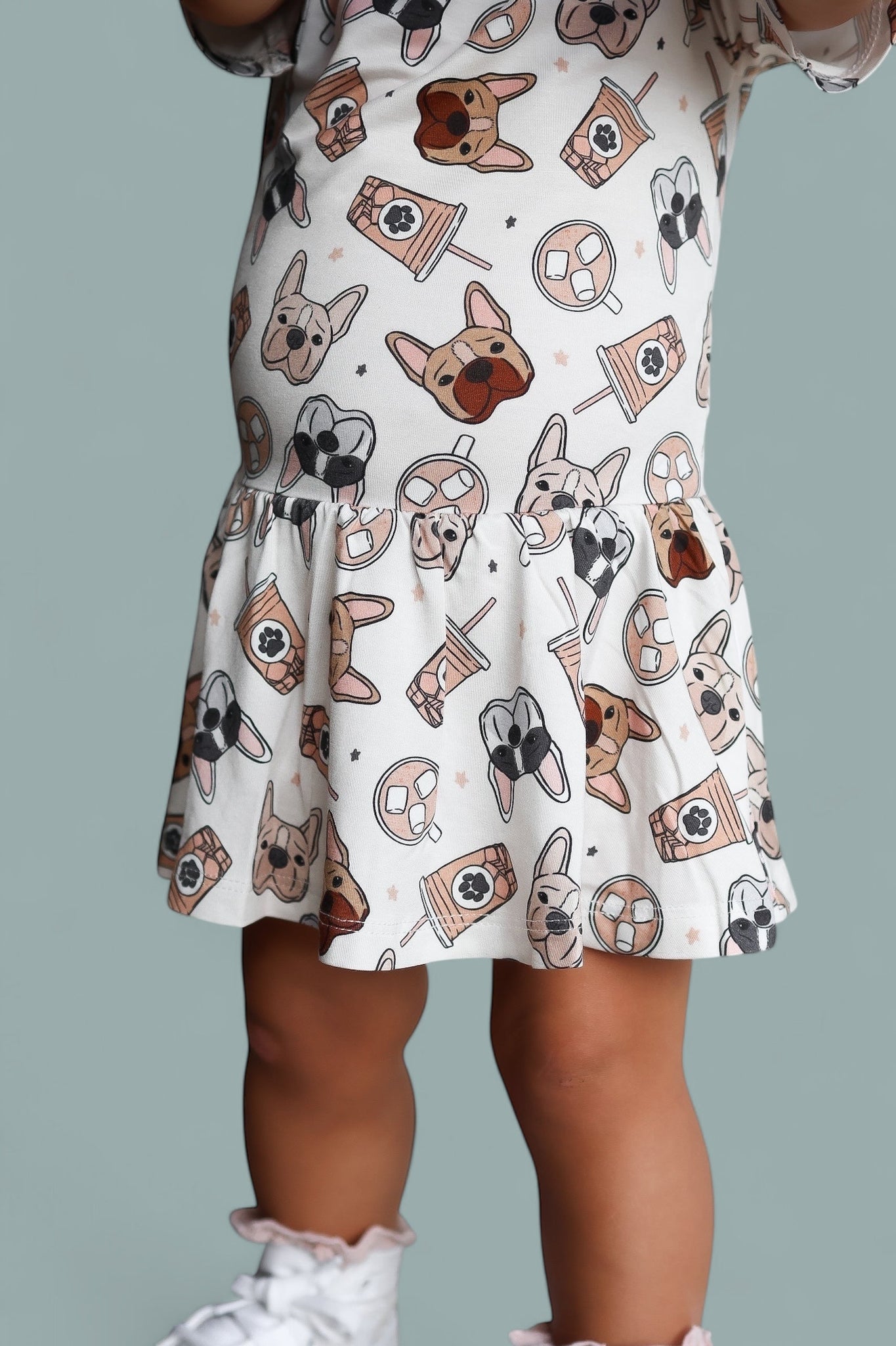 This adorable Dream Bodysuit Dress is a must-have for your little girl! With its cute design featuring favorite drinks and adorable Frenchies, it'll be an instant hit. Don't miss out on this cuteness overload!