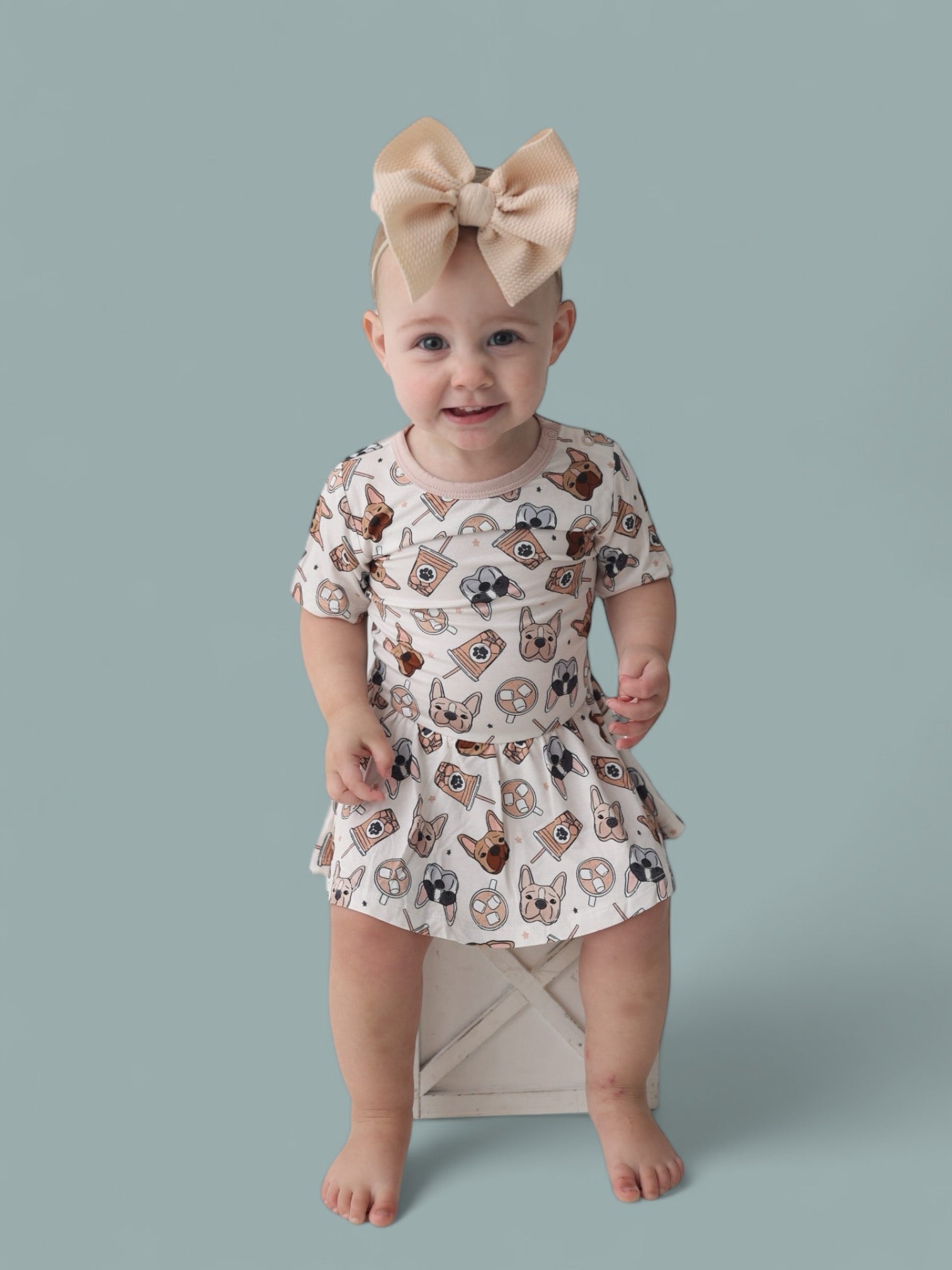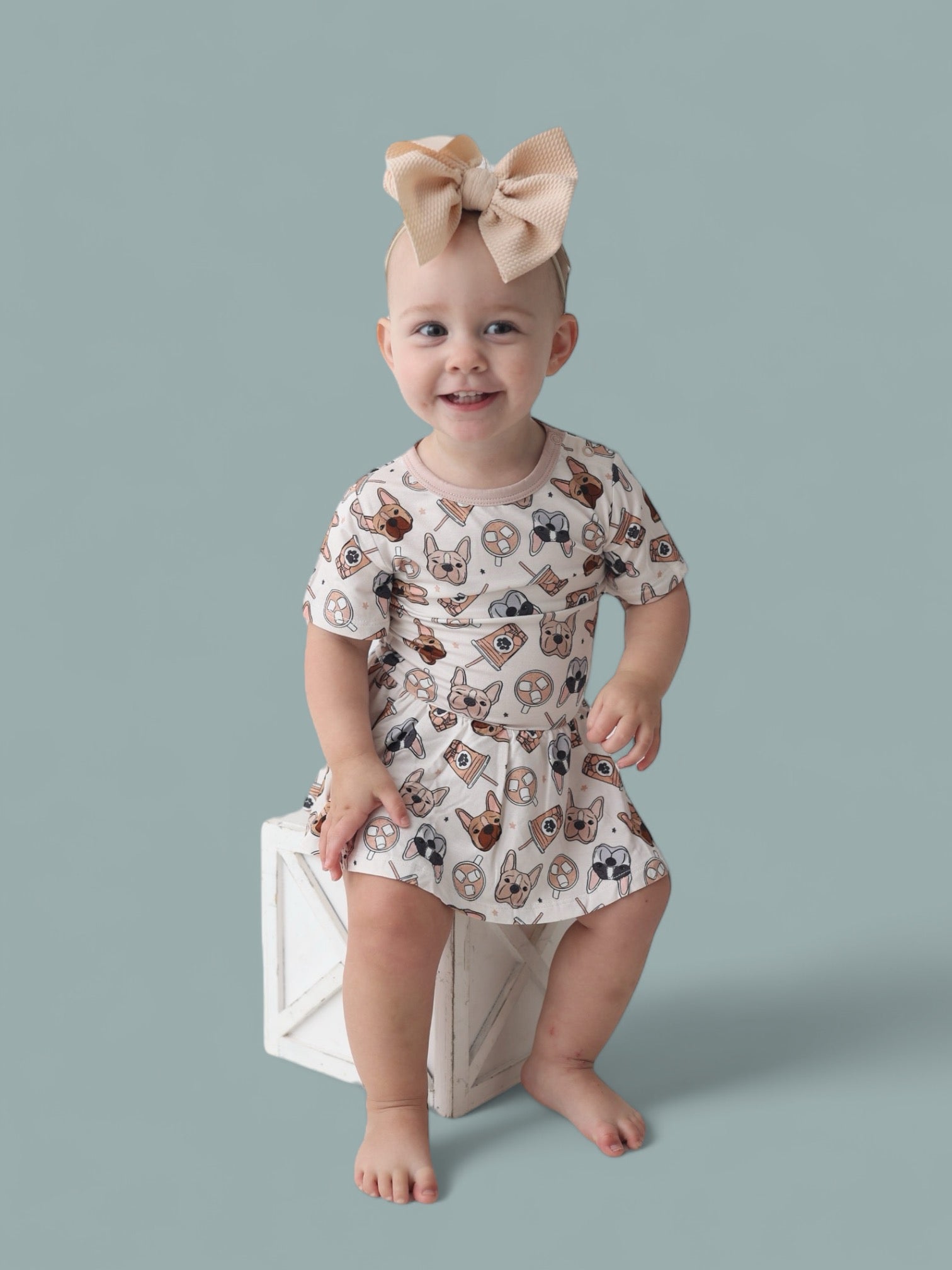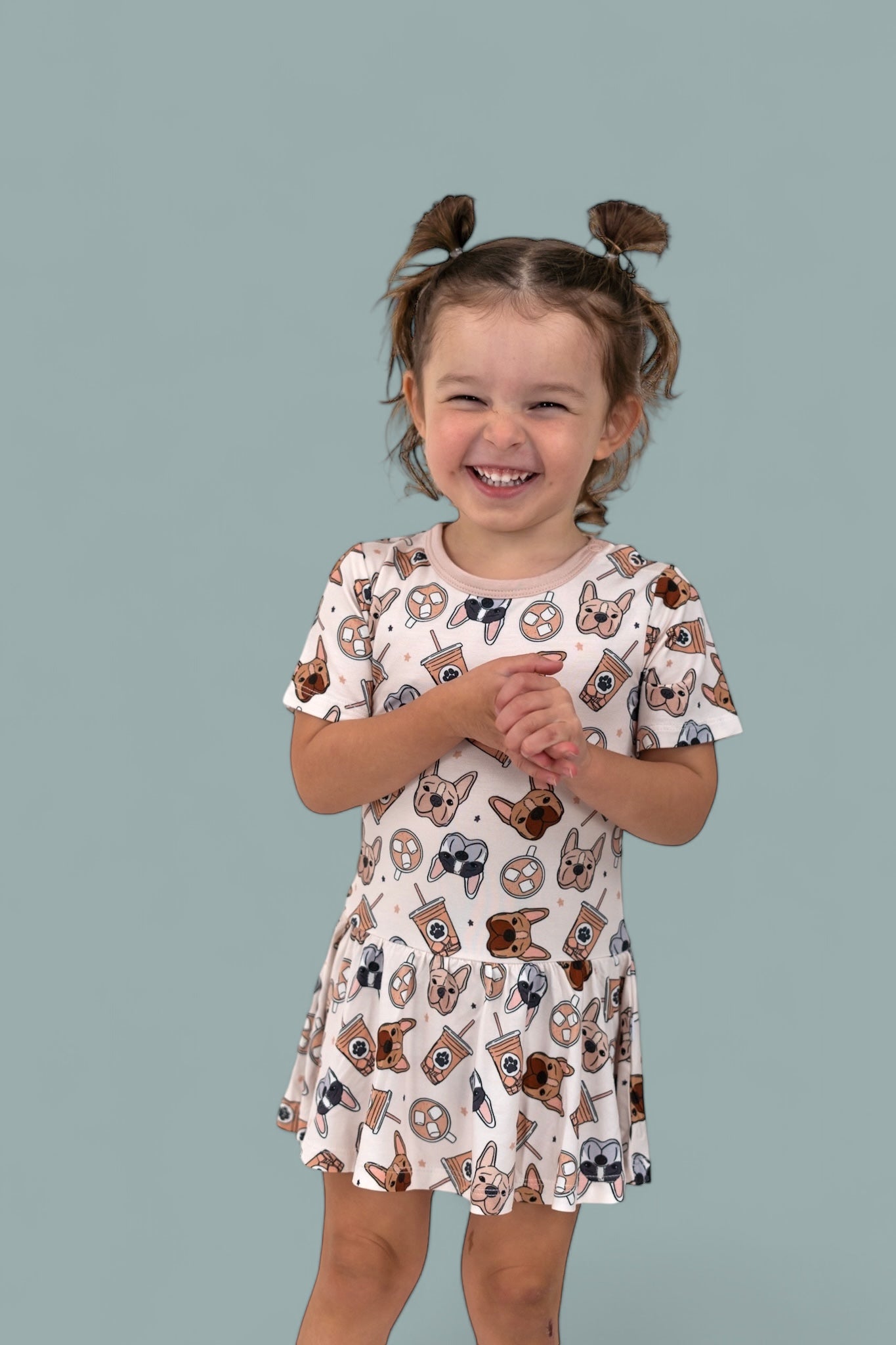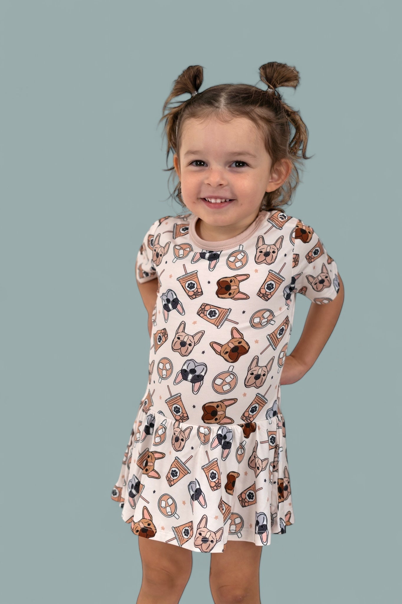 This adorable Dream Bodysuit Dress is a must-have for your little girl! With its cute design featuring favorite drinks and adorable Frenchies, it'll be an instant hit. Don't miss out on this cuteness overload!