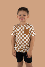 Bring the laid-back vibes of a sun-soaked vacation straight to your little one's wardrobe with the Sandy Beach Checkers Dream Pocket Tee. Featuring a classic brown and white checkerboard print, this tropical checkered design is elevated with minimalist palm tree silhouettes, evoking the carefree charm of sandy shores and ocean breezes. Whether lounging by the waves, playing under the palms, or simply enjoying a sunny day, this coastal fashion pattern is the perfect blend of classic style and beachy relaxation.
