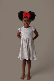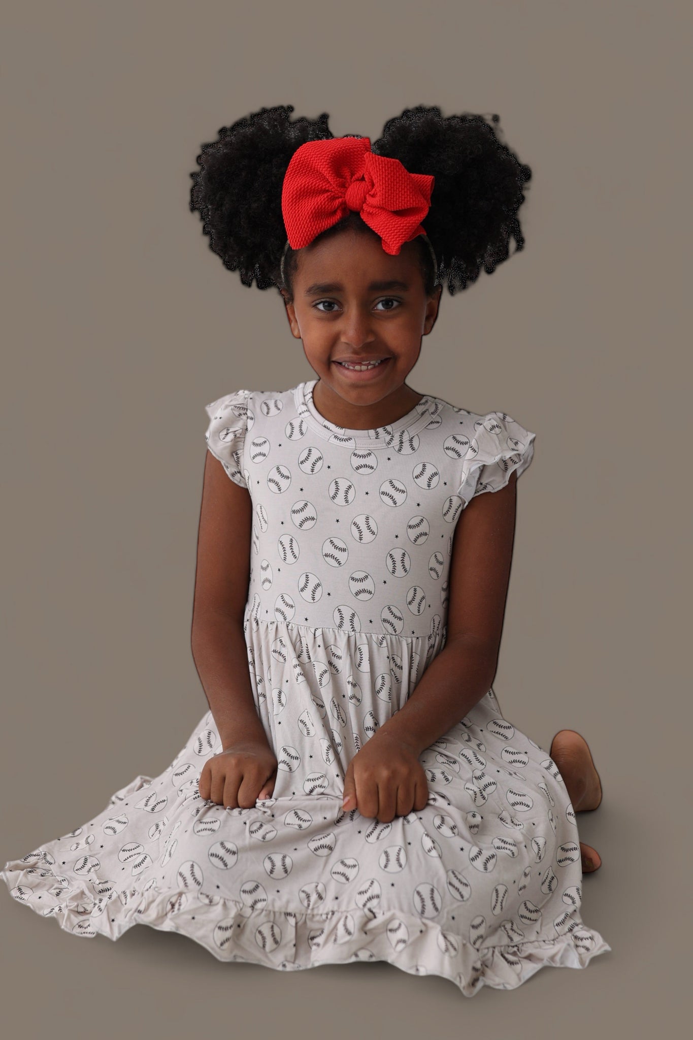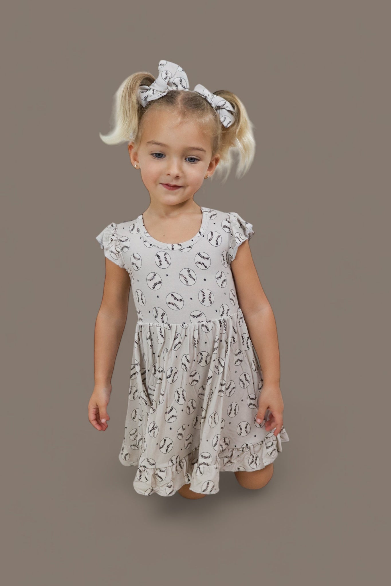 Introducing the Swing for the Stars Dream Cap Sleeve Ruffle Dress—the cutest way to bring America's favorite sport into your little one’s wardrobe! This charming dress features a light grey pattern with baseballs and navy stars, making it a home run in both style and comfort. Perfect for twirls, spins, and playful days at the park, this dress is designed to bring smiles that make every moment special.