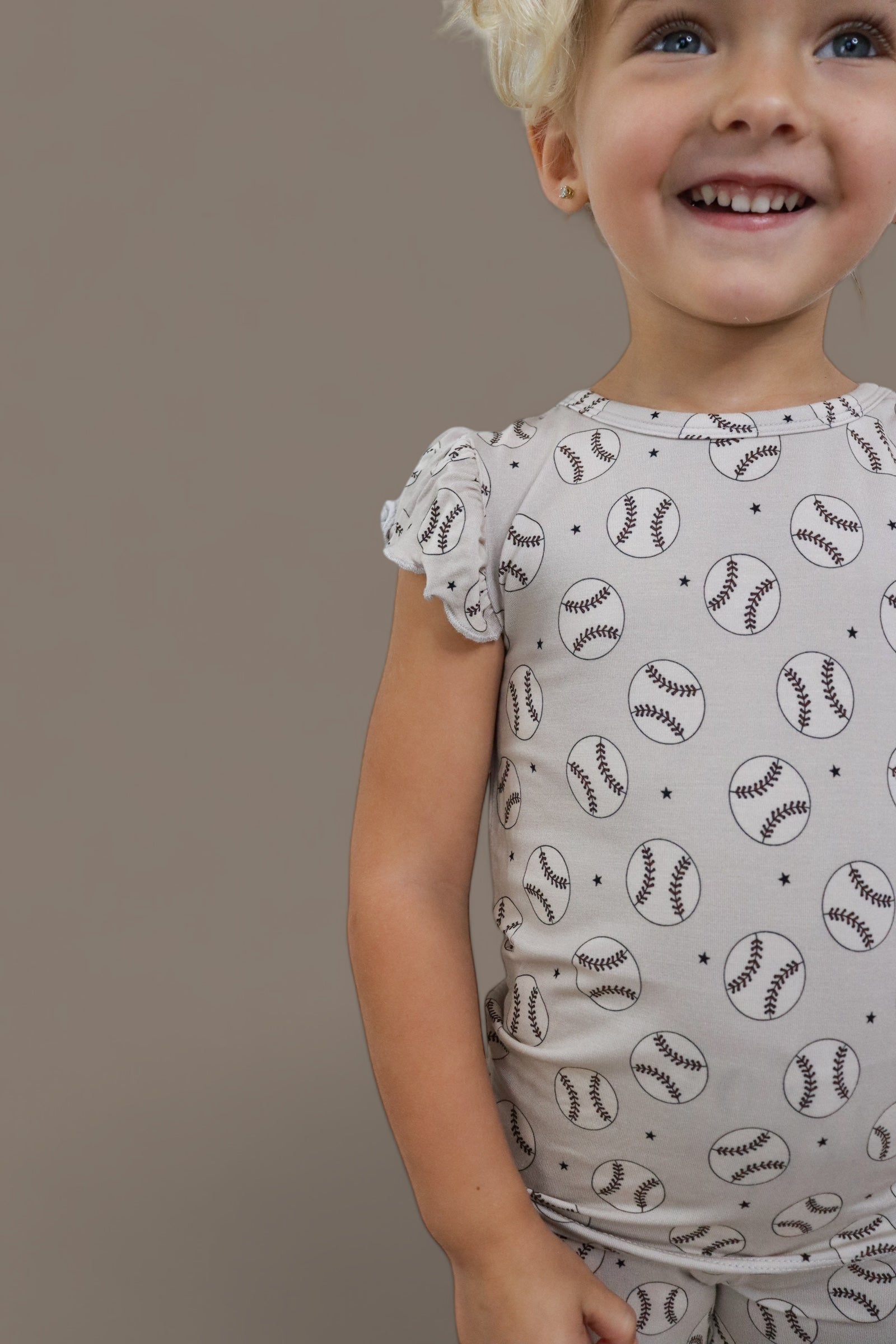 Introducing the Swing for the Stars Dream Ruffle Short Set—the ultimate girly outfit with a sporty twist! Featuring a playful light grey design with baseballs and navy stars, this ruffle short set is perfect for your little one to stay cute and comfy, whether she’s playing or napping. The adorable ruffle detailing makes this set a show-stopper, and we guarantee that people will ask where you found the cutest outfit!