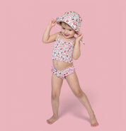 Designed for comfort and cuteness, this tankini includes a smocked top with ruffle details, pom-pom trim, and matching bottoms, all made with UPF 50+ swim fabric to help protect delicate skin under the sun.