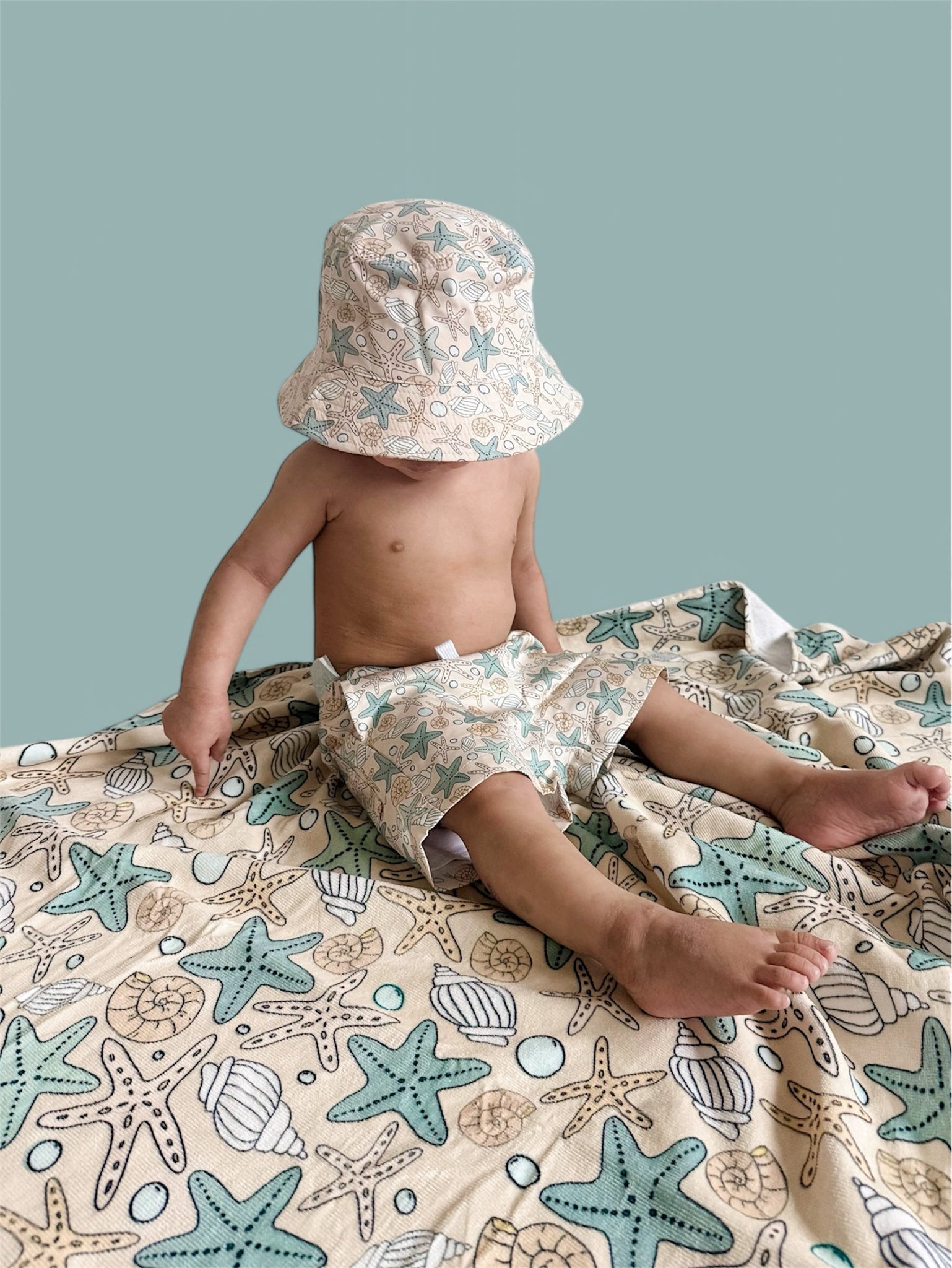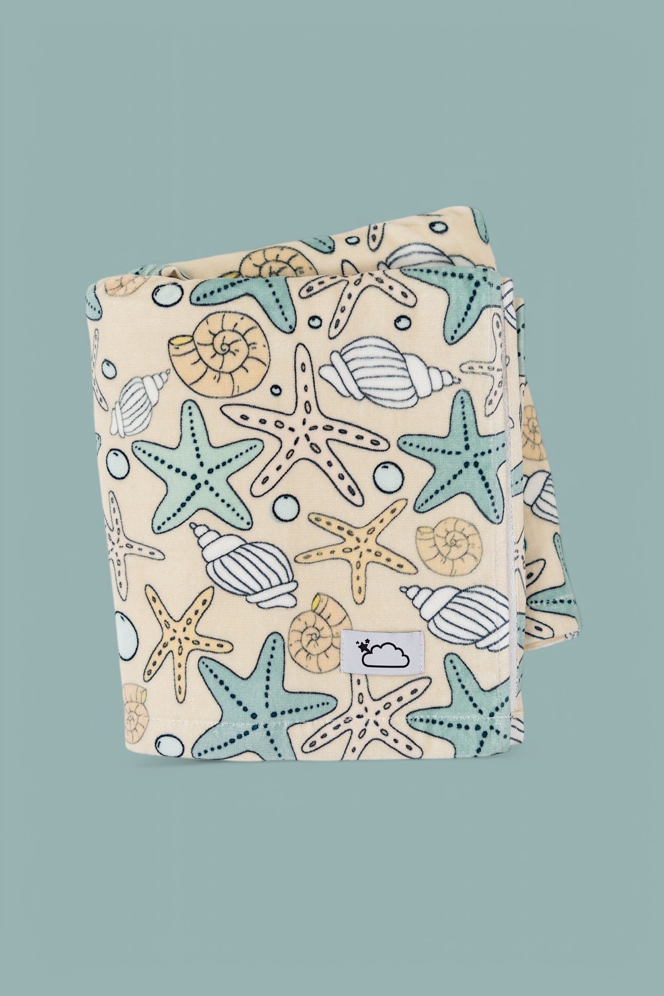 This print features a beach-themed pattern with a whimsical, hand-drawn style. It includes a repeating design of starfish, spiral seashells, conch shells, and small round bubbles. The starfish are mostly in two colors: soft aqua blue and a sandy beige, some with dotted detailing. The seashells are in soft neutral tones—beige and light blue—with delicate line work. The background is a pale, off-white or cream color that enhances the coastal, relaxed vibe of the print. Overall, the design gives a calm, seaside feel and would be great for summery fabrics, beach decor, or children’s items.