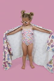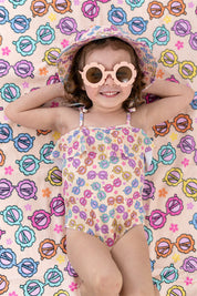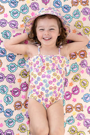 Let your little sunshine shine bright in the Ray of Sunshine Dream One-Piece Swimsuit! Featuring a vibrant retro sunglasses print, this swimsuit is all about groovy summer vibes and carefree beach days. With playful flower-shaped sunglasses and colorful blooms, your little fashionista will be making waves in style!