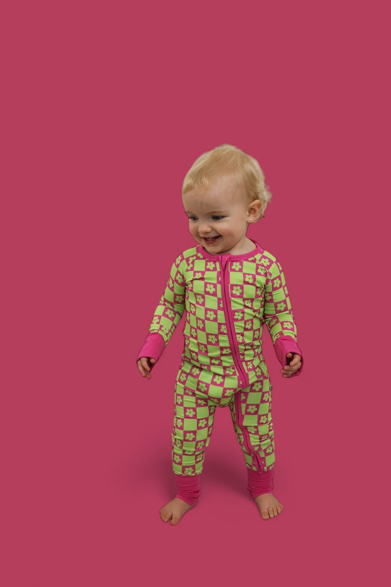 Make a bold statement with the Wild Daisy Checkers Dream Romper—a neon explosion of lime green and bright pink! This romper features an eye-catching neon checkered pattern paired with lime green daisies, perfect for both sleep and play. Crafted from the softest and most breathable bamboo viscose material, your little one won’t want to take it off!