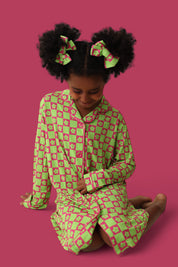 - Vibrant neon lime green and bright pink design with lime green daisies and checkers, perfect for fun and stylish playtime