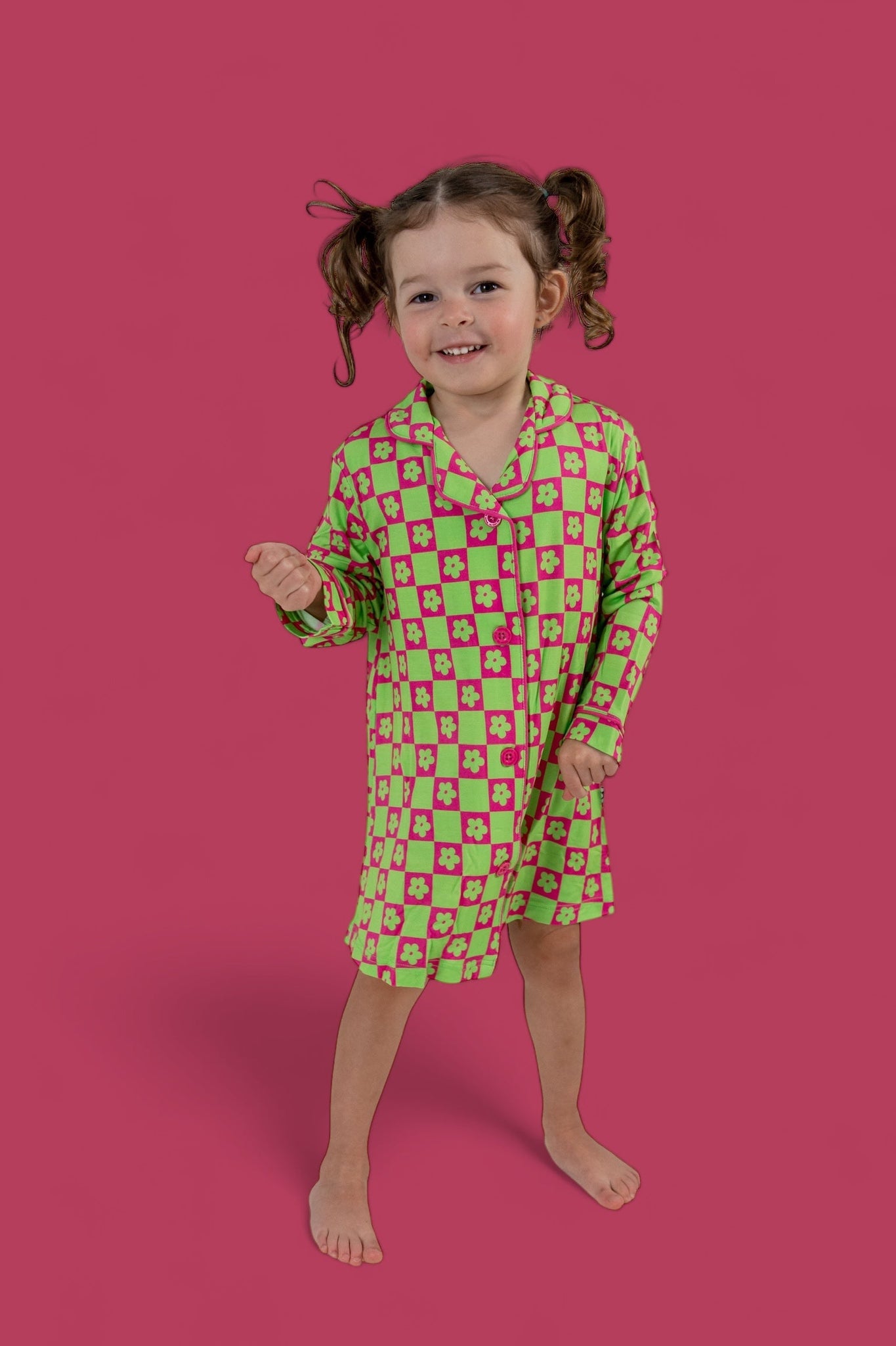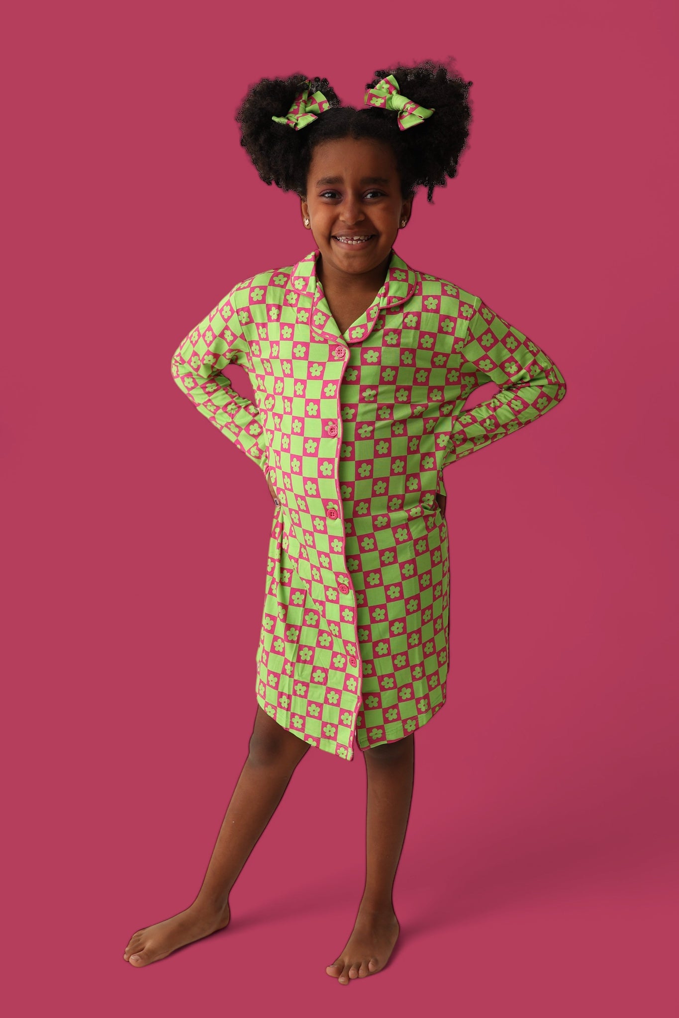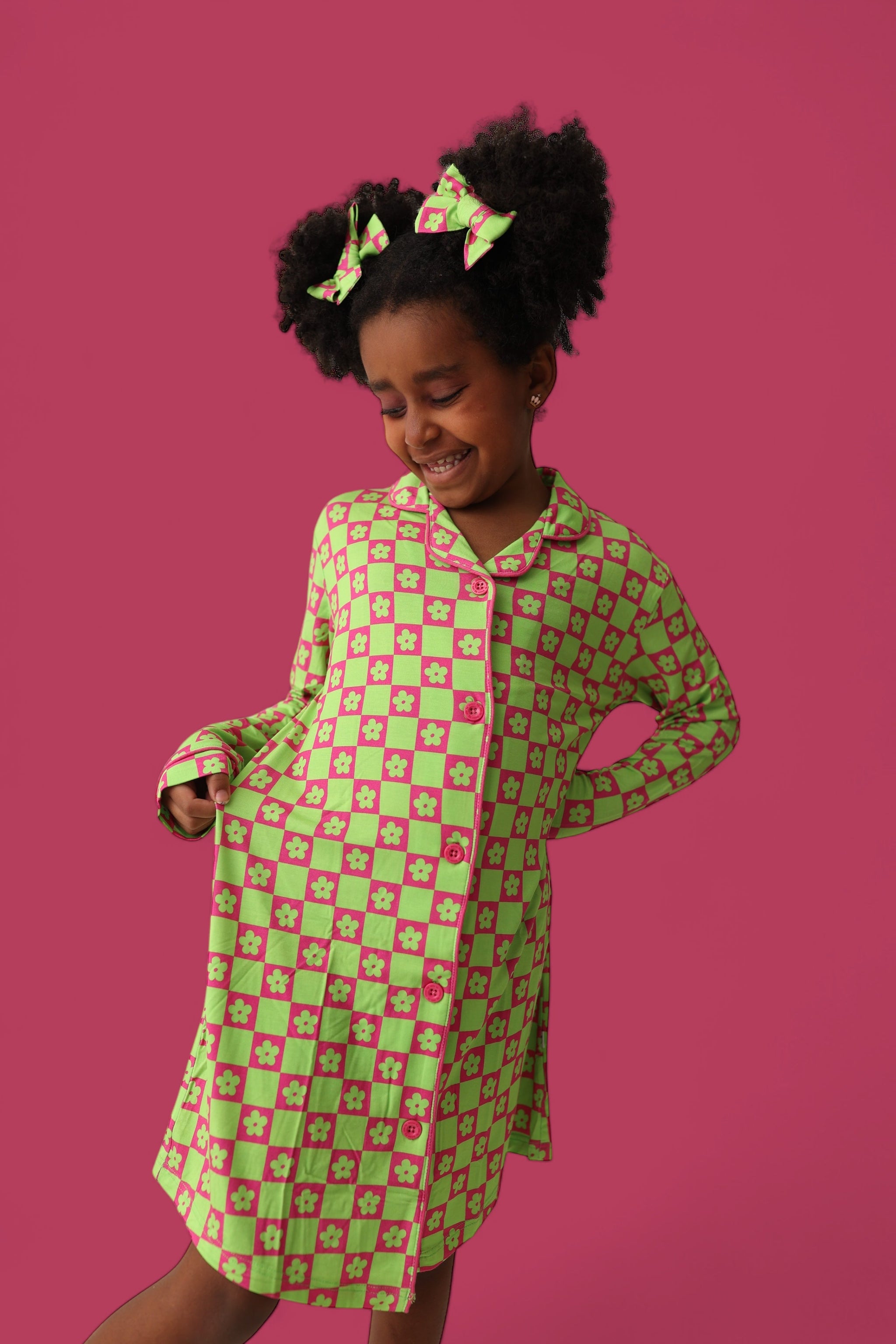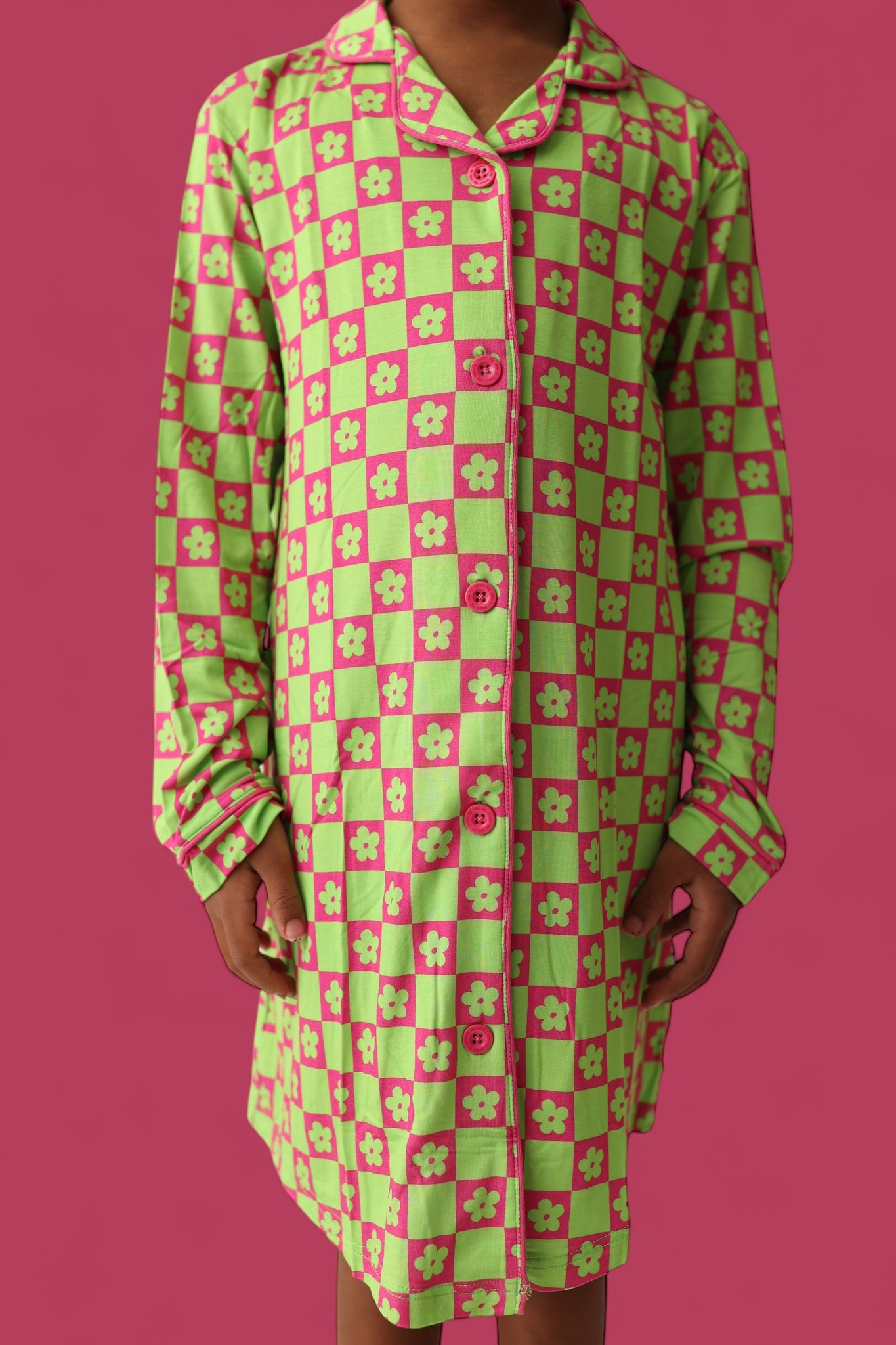 The Wild Daisy Checkers Girl's Dream Gown is the perfect mix of vibrant fun and cozy comfort, designed to make your little one stand out in the best way possible! The bold neon lime green and bright pink color combo, featuring lime green daisies and neon checkers, is sure to turn heads while offering maximum comfort.