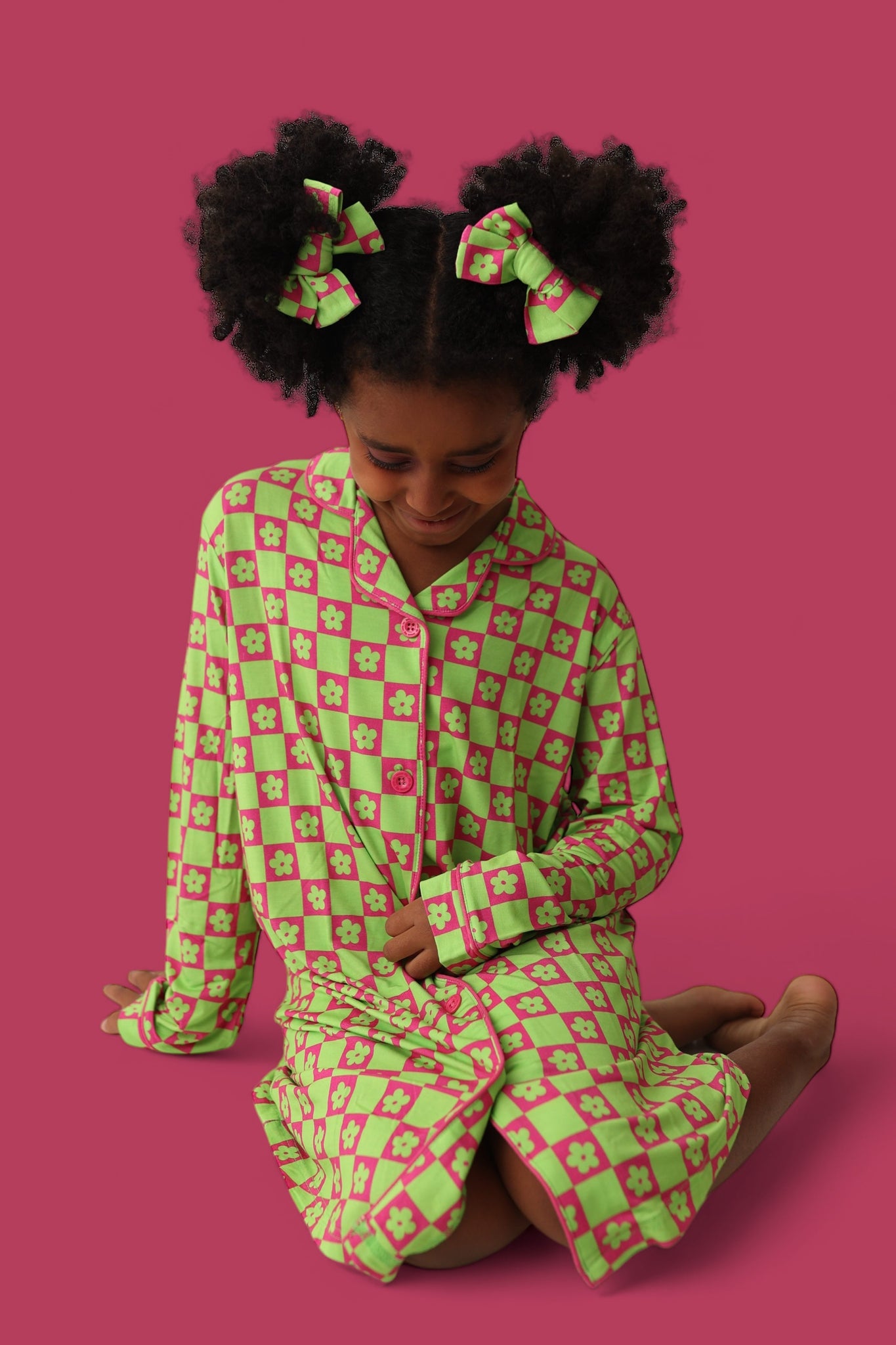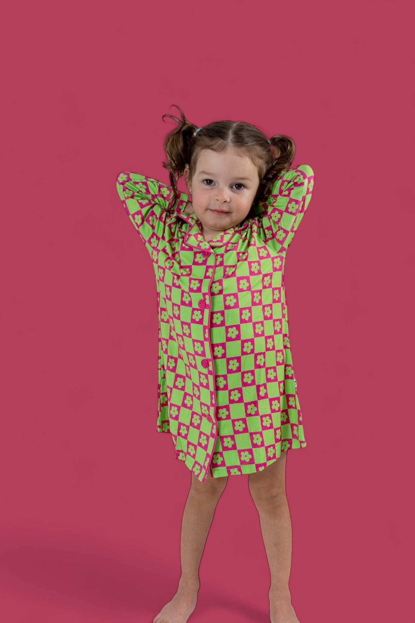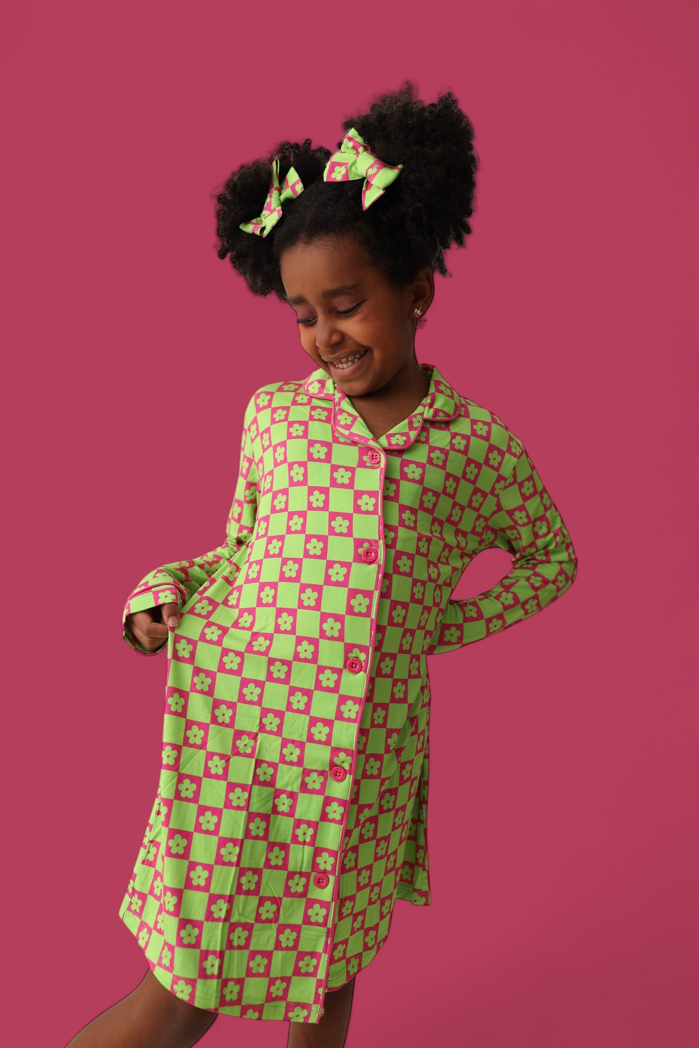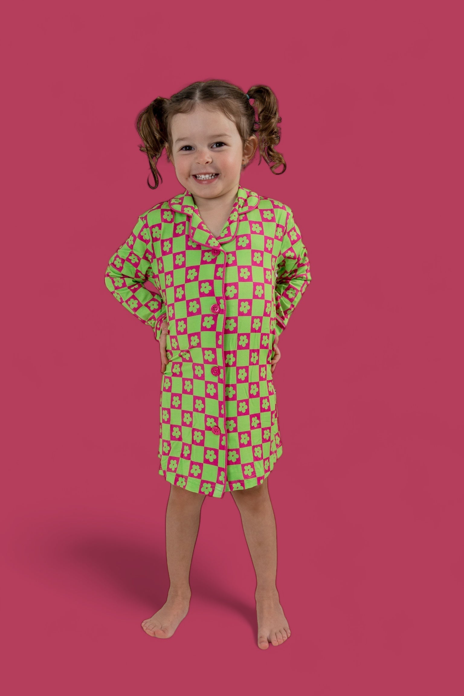 The Wild Daisy Checkers Girl's Dream Gown is the perfect mix of vibrant fun and cozy comfort, designed to make your little one stand out in the best way possible! The bold neon lime green and bright pink color combo, featuring lime green daisies and neon checkers, is sure to turn heads while offering maximum comfort.