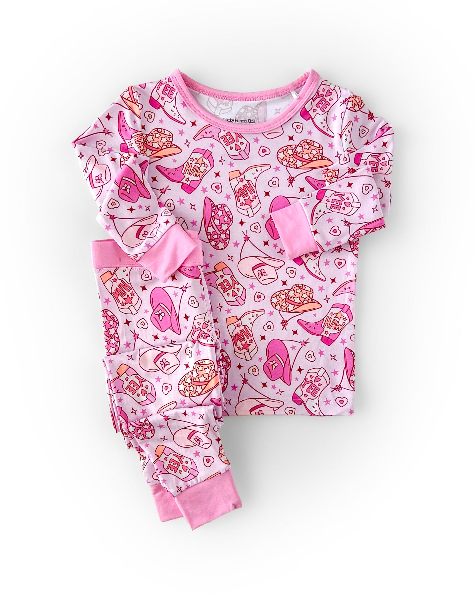 Yeehaw! Your little one will love our Bamboo Two-Piece Set | Cowgirl Cutie! With its fun pink print and adorable cowboy boots, hats, and Western-inspired designs, this set is perfect for playtime, family photos, and everything in between. Crafted from a blend of bamboo viscose and spandex, it’s as soft and stretchy as can be, offering unbeatable comfort for your little cowgirl. Perfect for playtime, naptime, or family photos, this set is ready for all the adventures your little one will saddle up for! Available in sizes 18-24M to 9Y, it’s perfect for bigger cowgirls looking to show off their style.
