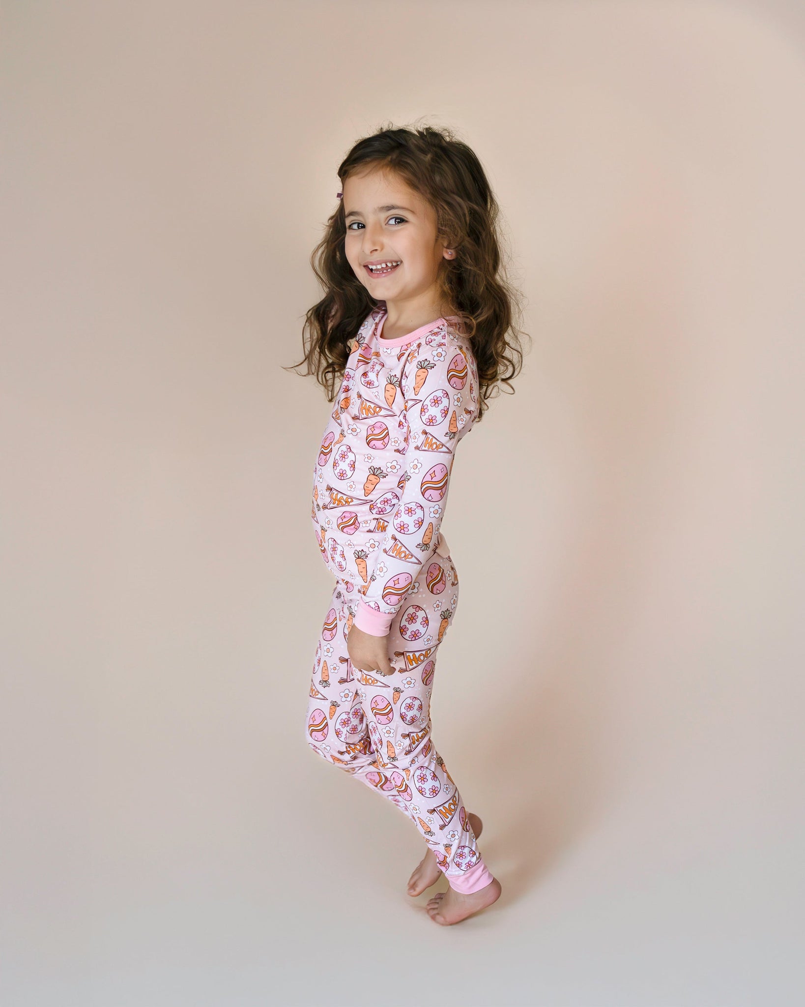 Hop into Easter in style with our Bamboo Two-Piece Set | Easter Hop! Designed with vibrant florals, playful eggs, and fun carrots, this set captures the joy and cheer of the season. Crafted from a premium blend of 95% bamboo viscose and 5% spandex, it offers an ultra-soft, stretchy feel that will keep your little one comfortable all day long. Perfect for playtime, nap time, or family photos, this set brings both coziness and cuteness in one.