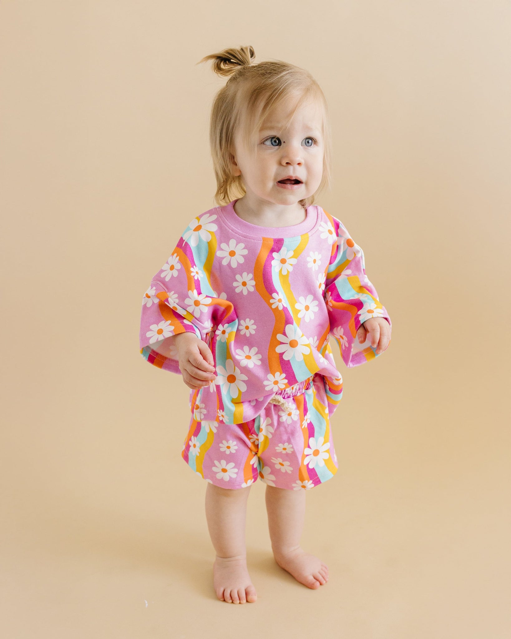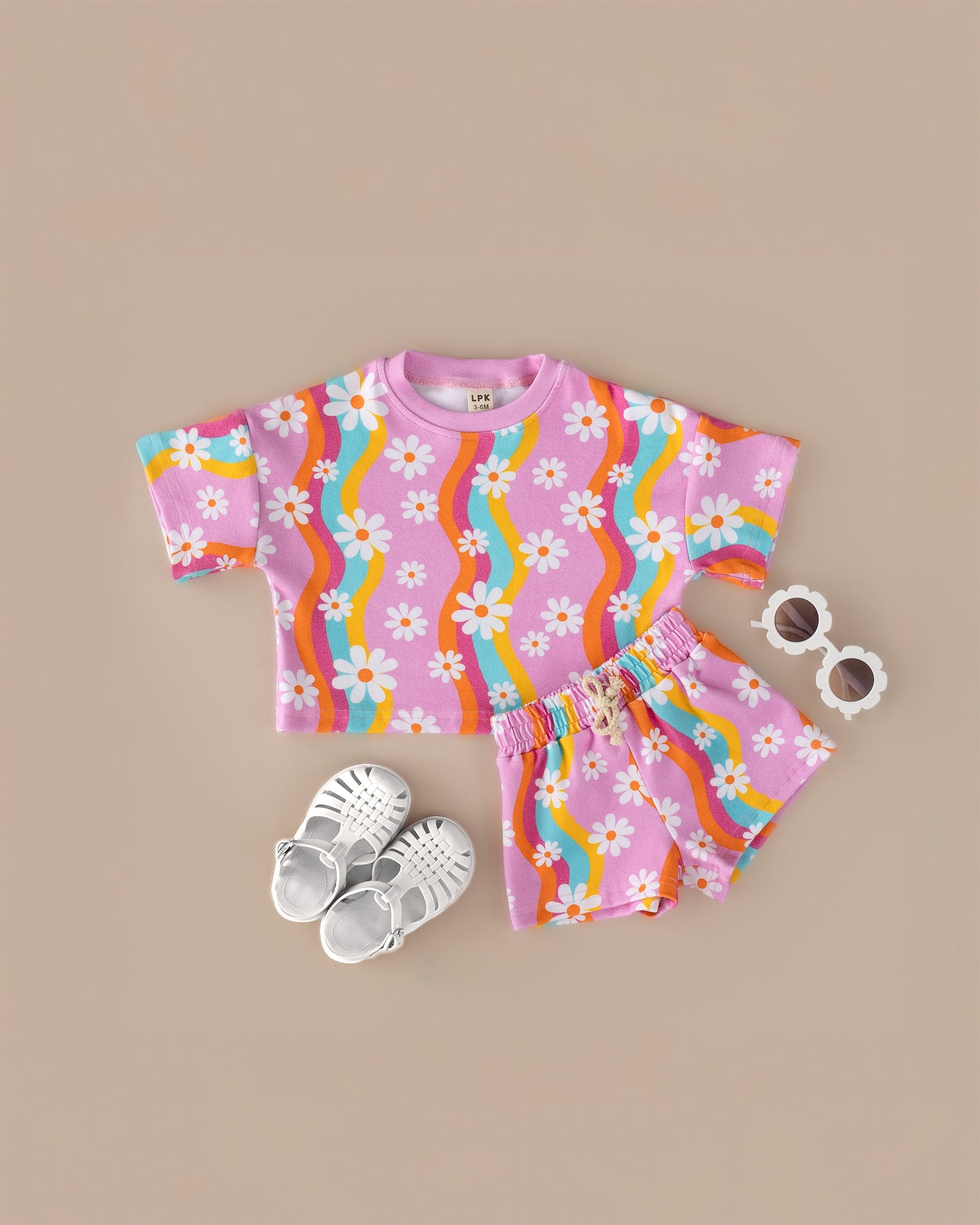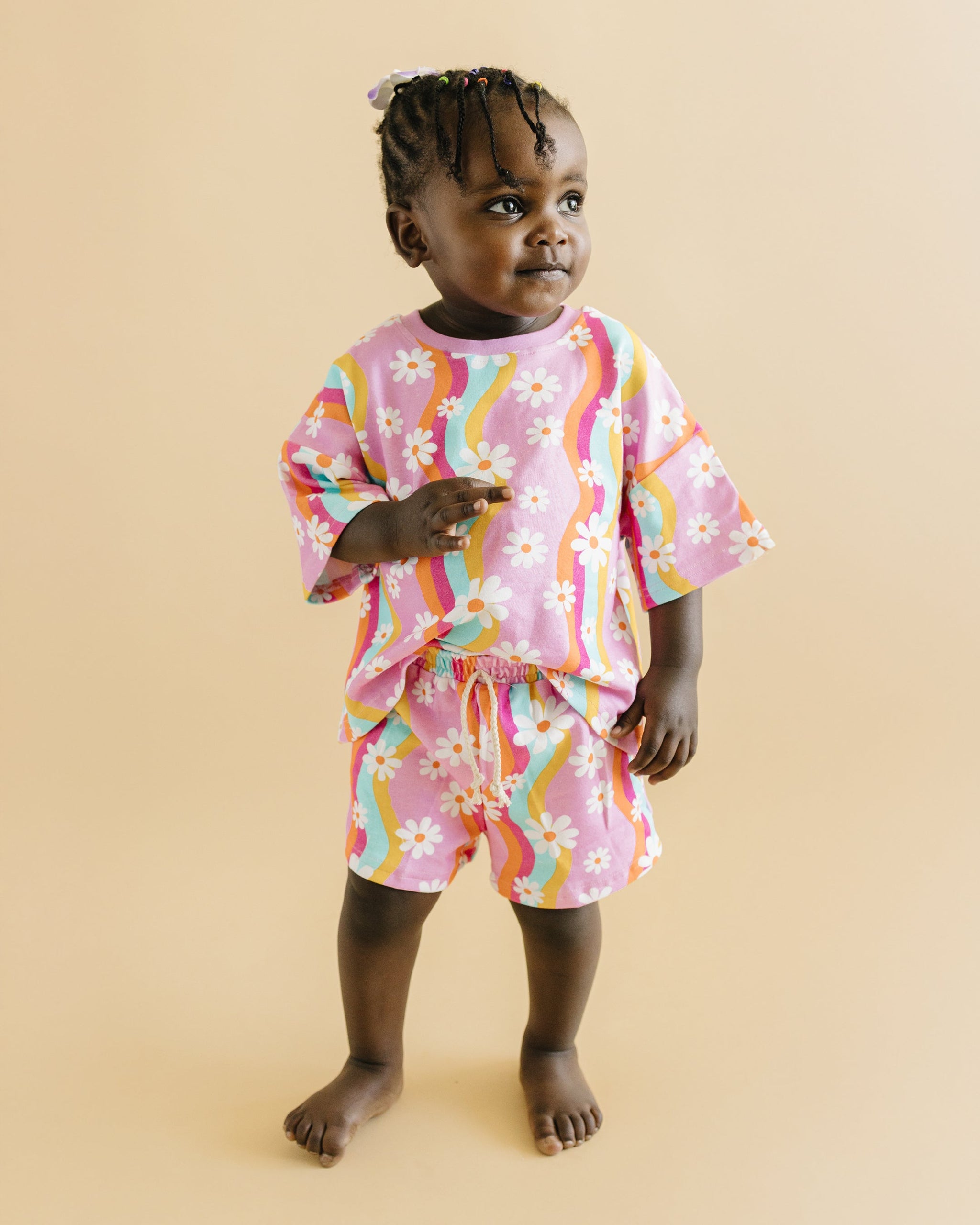 Bring the sunshine wherever you go with our Groovy Daisy shorts set! Featuring a vibrant floral print in a stunning mix of colors, this set is perfect for any day spent in the sun. Whether you're lounging at home or enjoying a day out, this playful, bold design will make sure your little one stands out with style.