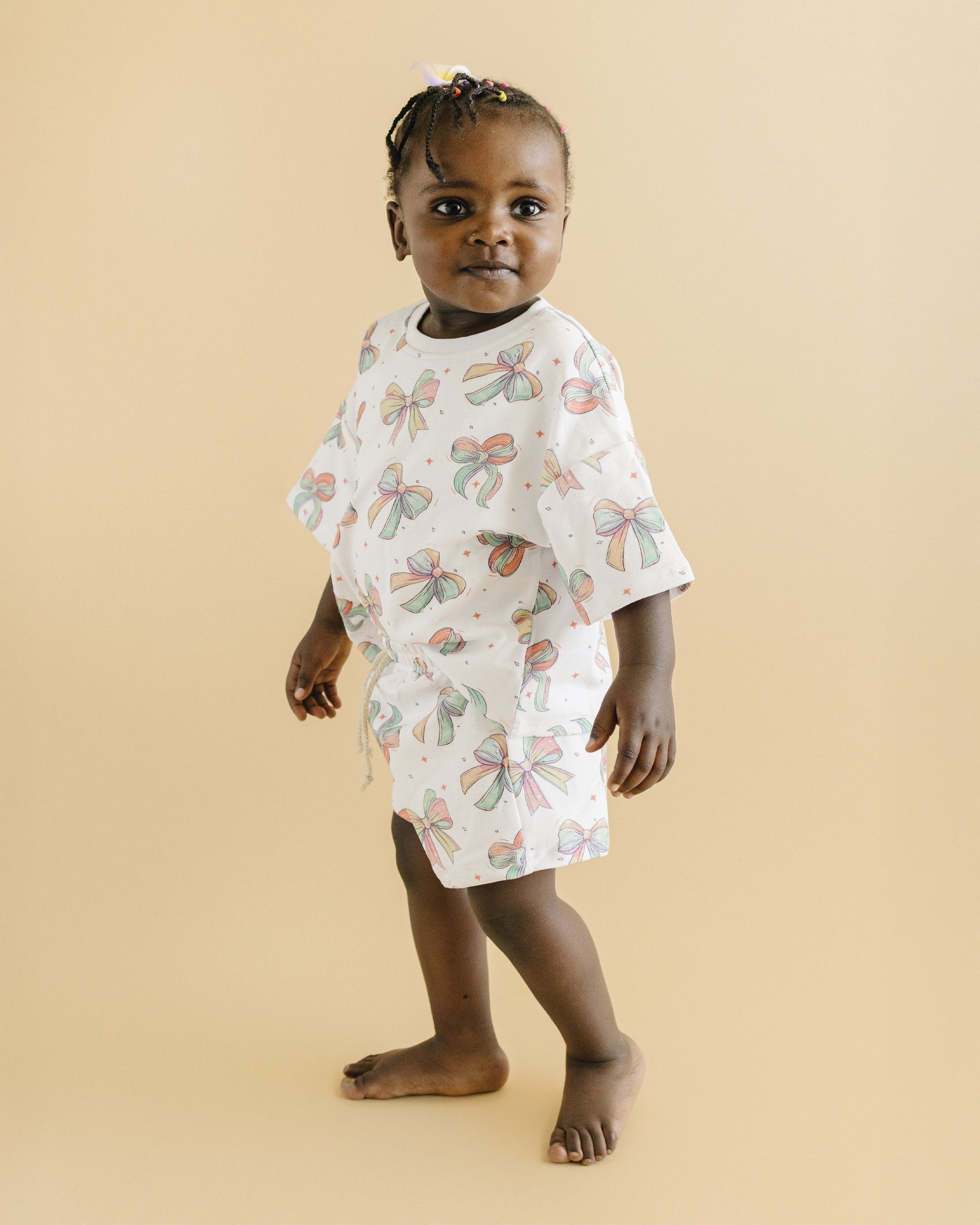 Let your little one shine in a burst of color with our Happy Bows shorts set! Adorned with rainbow-colored bows, this set is full of joy and perfect for any playful adventure. The soft, breathable fabric ensures comfort all day long, and the fun design will bring smiles wherever they go.