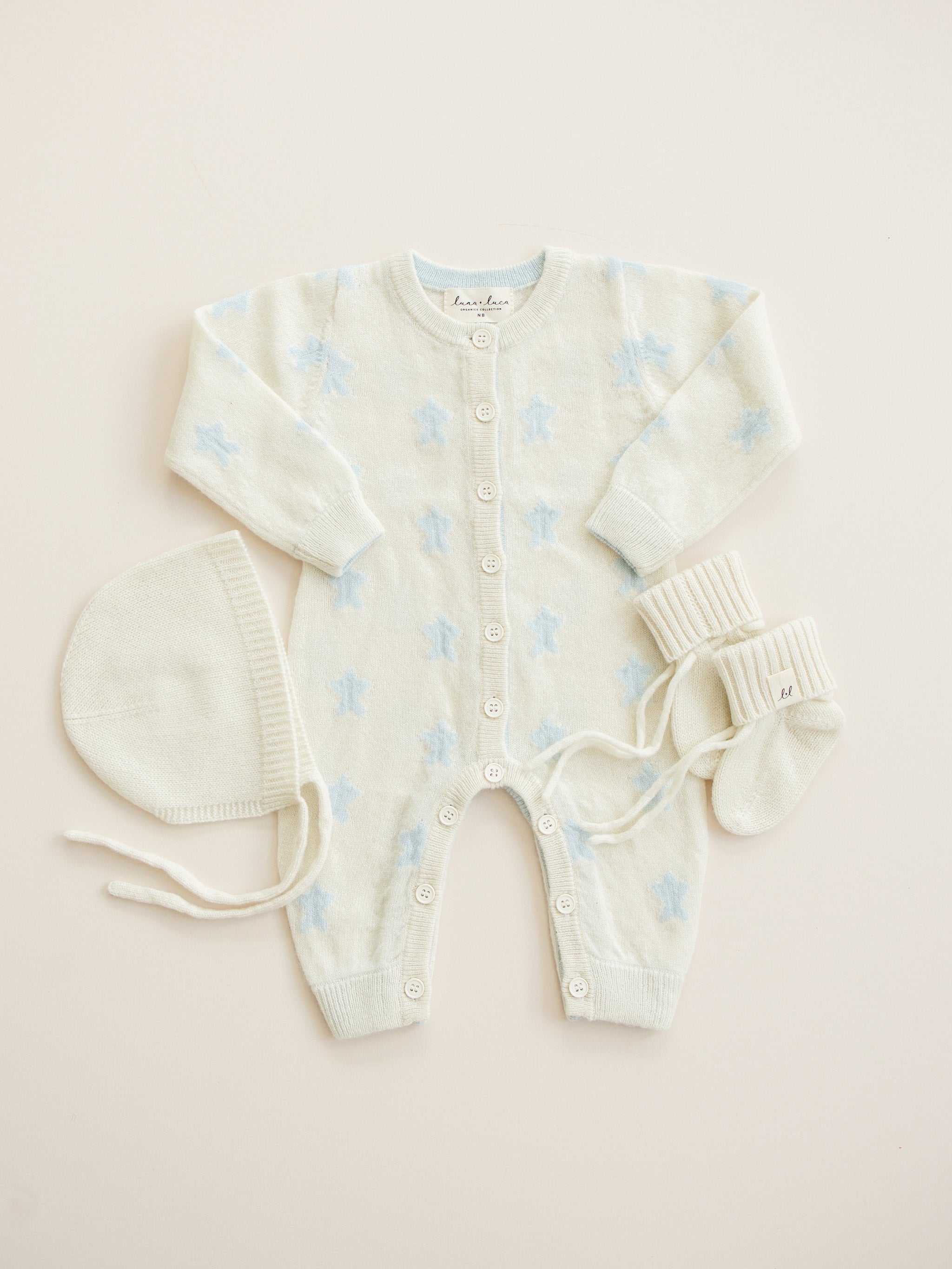 Give the gift of the ultimate luxury: cashmere! Our Stars Cashmere Luxxe Set is the perfect set for the sweetest baby in your life with its silky cream knit and delicate blue star pattern. This dreamy set will wrap your little one from head to toe in cashmere. Included is a long sleeve jumpsuit, a tie bonnet, and the comfiest booties. Whether it's for a special occasion, every day luxury, or sweet dreams, our Stars Cashmere Luxxe Set wraps up all your baby's needs in one darling little bundle!