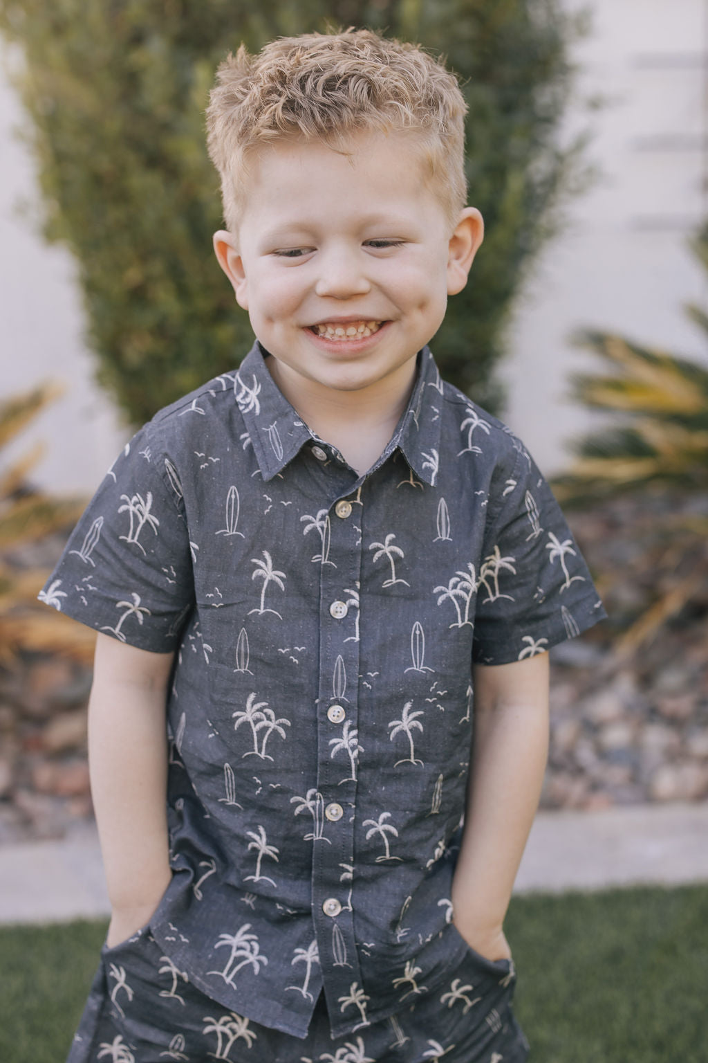 Get ready for a day at the beach with this trendy Navy Surfer Linen Button Up Shirt from Mebie Baby's Resort Wear Collection. Made from high-quality linen, this shirt is not only fashionable but also comfortable. The surfboard and palm tree print adds a fun and playful touch, perfect for a day of relaxation or exploring the coast. Whether you're hitting the waves or strolling along the shore, this shirt will keep your little one looking cool and feeling great.